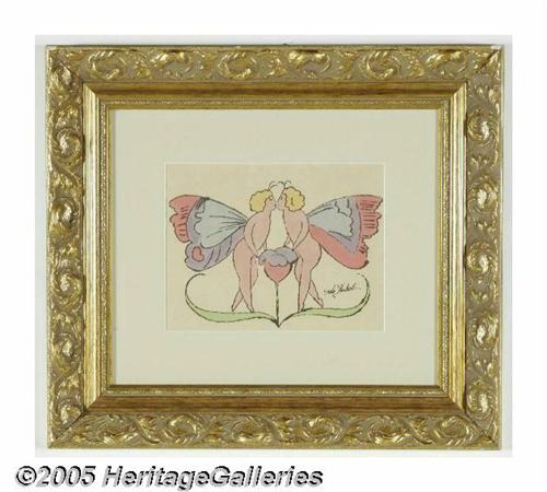 <B>ANDY WARHOL (American 1928-1987)</B></I><BR>Two Butterflies<BR>Hand colored lithograph on paper<BR>8.5in. x 11in.<BR>Signed in pen lower right<BR><BR>Condition Report: Image is slightly light stained and colors are slightly faded<BR>