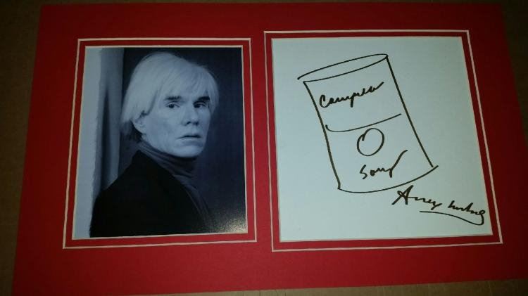 A hand drawing of a tin of Campbells soup by Andy Warhol, mounted with a picture of Andy Warhol. The drawing is: 7x7 inches. Condition Report: Good.