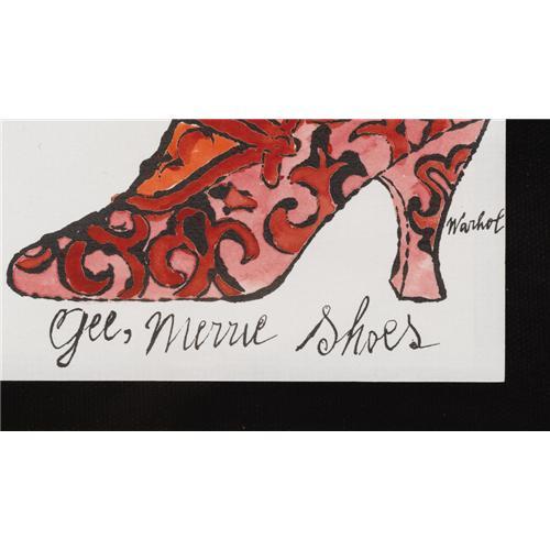<B>ANDY WARHOL</B></I> (American 1928-1987)<BR><I>Gee, Merrie Shoes,</B></I> 1956-<BR>Offset lithograph with hand coloring on paper<BR>9 x 8 inches (22.9 x 20.3 cm)<BR>Signed lower right with facsimile signature <I>Warhol,</B></I> and inscribed <I>Gee, Merrie Shoes</B></I>; and a blue oval with illegible lettering bleeding through in the lower left corner <B>Condition Report:</B> Normal signs of wear as appropriate with age, glued down to the board and with very minor wrinkles to the right side.<BR><BR><b>Shipping:</b> Requires 3rd Party Shipping (<a target="_blank" href="http://www.heritageauctions.com/common/shipping.php">view shipping information</a>)