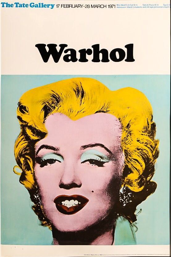 AN ORIGINAL EXHIBITION POSTER OF MARILYN MONROE BY ANDY WARHOL FOR THE TATE GALLERY IN 1971. MEASURING ABOUT 20x30 INCHES. SOME STAINS AND WRINKLES.
