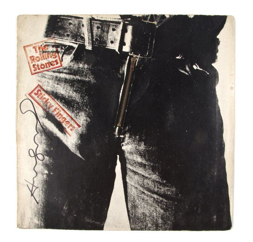 Rolling Stones original Sticky Fingers album and photographic album cover designed by Warhol with zipper, signed by Warhol in black felt.