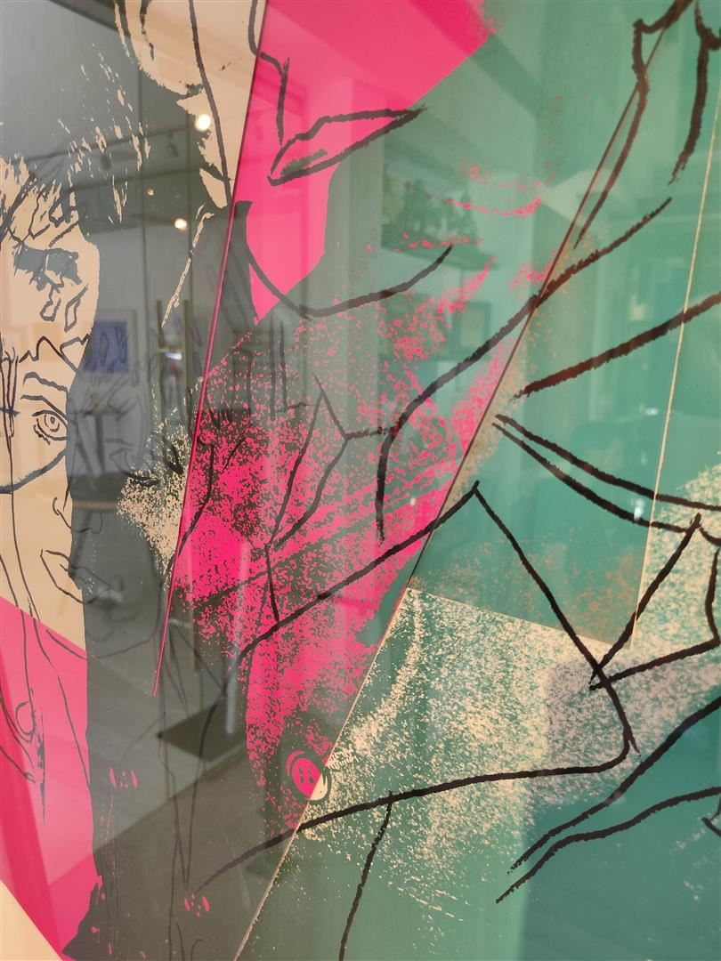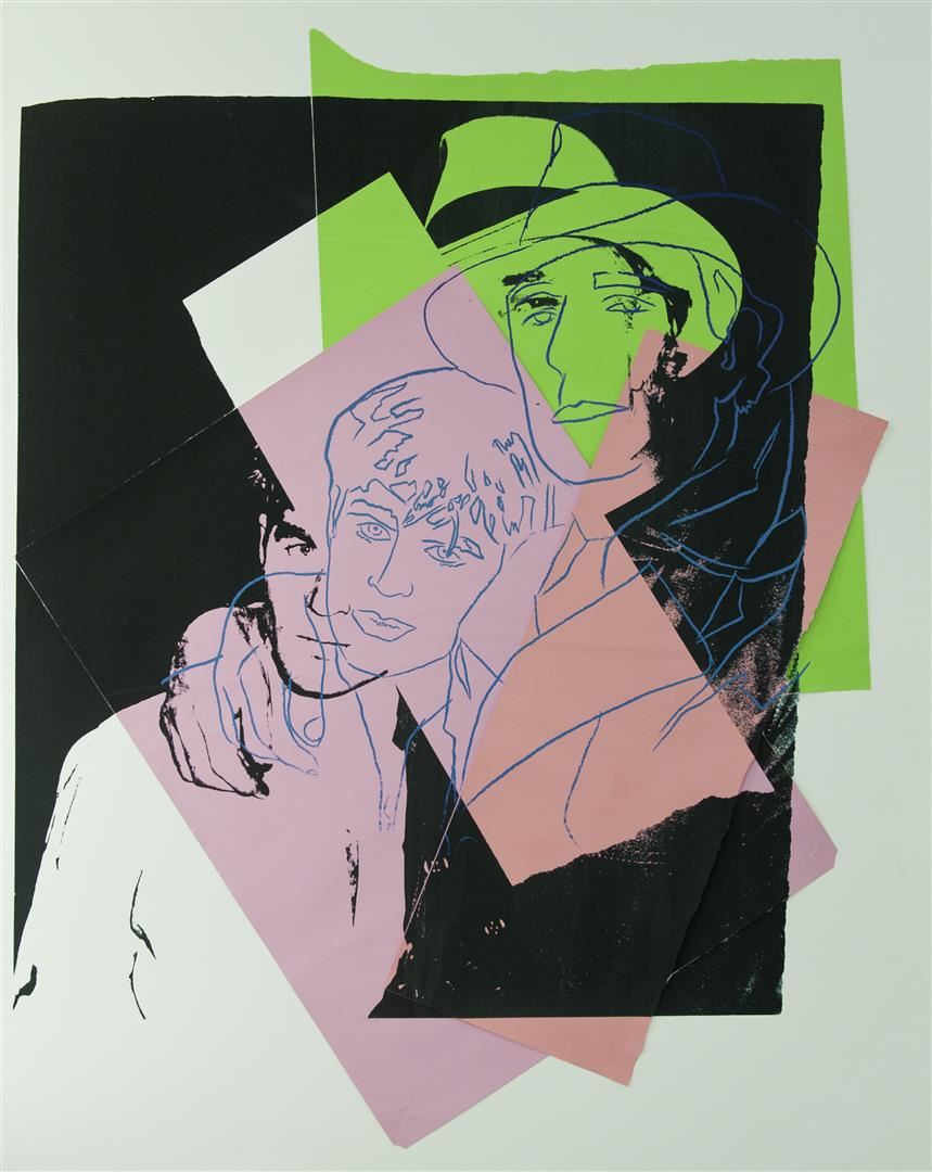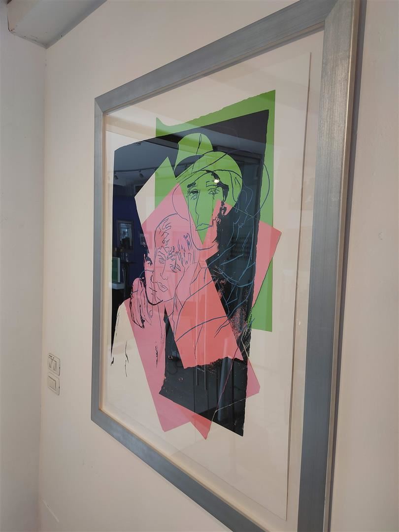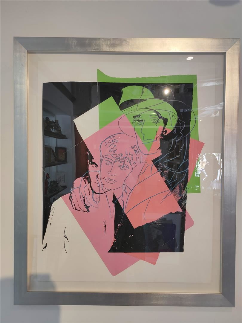 ANDY WARHOL 'Some Men Need Help', 1982, ONE-OF-A-KIND ORIGINAL on Paper, 40" x 32" (101.6 x 81.3 cm). Framed Size, 49x41. 'Some Men Need Help' was a two-man play written by John Ford Noonan. It opened on Broadway at the 47th Street Theatre in New York on October 28th, 1982. Starring Philip Bosco and Treat Williams it was also produced in association with Jane Holzer - a former Warhol 'superstar'. Mr. Noonan has written the kind of two-character exercise that is treasured in acting-school classes. Hudley T. Singleton 3d is a once most-likely- to-succeed young executive who has taken to spending much of his time in an alcoholic stupor on his kitchen floor. The elderly Gaetano Altobelli is his vulgar Italian neighbor who, for some unfathomable reason, has decided to help him. ''You don't have to drink,'' says Gaetano, "there are better ways to get attention." Once again, as he did in "A Coupla White Chicks Sitting Around Talking,'" Mr. Noonan drags two very different characters into an unlikely situation and depends on the mere juxtaposition to keep the action spinning. In this case, however, the vehicle stalls early on, and stays that way. Andy Warhol based this artwork on a photograph used for the promotional poster he made for the John Ford Noonan play. It shows characteristics of Warhol's work from the 1980s. The TATE Museum in the UK has a Lithograph on paper of this work. In this work Warhol has combined blocks of color which, through their irregularity and breaking out of the image's frame, appear collaged. On top of this is a printed photographic image and a screen printed linear drawing, which highlights details of the figures. Authenticated by The Estate of Andy Warhol & The Warhol Foundation, number 87.010!