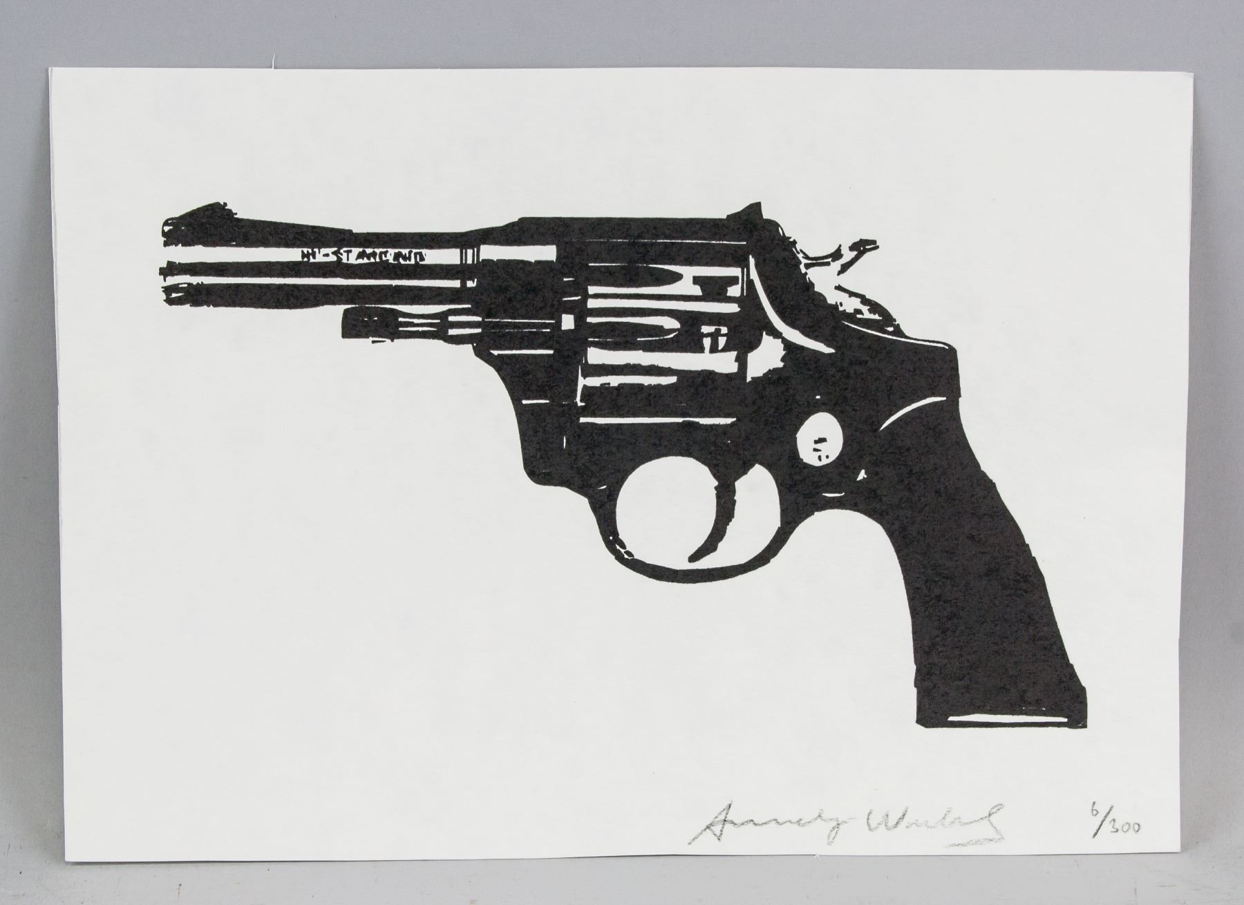 Silkscreen print on paper. Featuring a black gun. Signed and attr. Andy Warhol (American, 1928-1987) on lower right margin. Stamped on verso "Harper Publishing". 7.9 x 11.4 inch (20 x 29 cm). Obsessed with celebrity, consumer culture, and mechanical (re)production, Pop artist Andy Warhol created some of the most iconic images of the 20th century. As famous for his quips as for his art-he variously mused that “art is what you can get away with” and “everyone will be famous for 15 minutes”-Warhol drew widely from popular culture and everyday subject matter, creating works like his 32 Campbell's Soup Cans (1962), Brillo pad box sculptures, and portraits of Marilyn Monroe, using the medium of silk-screen printmaking to achieve his characteristic hard edges and flat areas of color. Known for his cultivation of celebrity, Factory studio (a radical social and creative melting pot), and avant-garde films like Chelsea Girls (1966), Warhol was also a mentor to artists like Keith Haring and Jean-Michel Basquiat. His Pop sensibility is now standard practice, taken up by major contemporary artists Richard Prince, Takashi Murakami, and Jeff Koons, among countless others.
