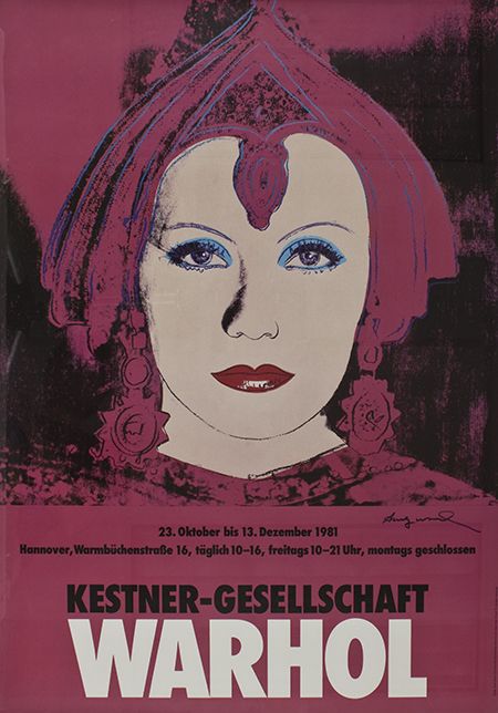 (1928 - 1987) American artist and the founder of pop art who gained instant notoriety with his depictions of the Campbell soup can and Brillo boxes. Great signed 23" x 35" color exhibition poster for his art show in Hanover, Germany, 1981, featuring Warhol's well-known image of Greta Garbo. Boldly signed at right in marker and in very good condition. Ideal for display!