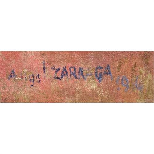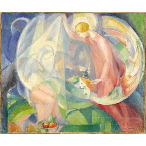 <B>ANGEL ZARRAGA (Mexican, 1886-1946)</B></I><BR><I>The Annunciation</B></I><BR>Oil on canvas<BR>21-1/4 x 25-3/4 inches (54.0 x 65.4 cm)<BR>Signed and dated lower right: <I>Angel ZARRAGA 19?6</B></I><BR> <BR>Angel Zarraga studied in the National Preparatory School in Mexico City and contributed to the magazine <I>Revista Moderna, </B></I>the voice of Modernism in Mexico. Zarraga also studied at the National School of Fine Arts with Deigo Rivera (1886-1957) and Saturino Herran (1887-1918). Following his studies and with the support of his family he left for France where he would remain for over thirty years. While in France he painted murals in the Castle of Vert Coeur and, in 1927, decorated the Mexican Legation in Paris. <BR><BR>By 1921, Zarraga completely embraced the cubist theories of Paul Cezanne (1839-1906). Zarraga breaks from representational painting by identifying spheres and cones of light rather than two dimensional planes. The formal composition is further enhanced by the use of bright blues, greens, yellows, and reds. Each field of color thus represents a separate plane. Cezanne's later paintings also utilize this style. The inclusion of the house and basket of fruit at the lower left further disrupt the arrangement of the composition.<BR><BR>A study of this work, <I>The Annunciation</B></I>, sold at Bonham's in London, on November 2, 2004, lot number 148.<B>Condition Report:</B> Canvas has been relined, surface dirt, unframed, otherwise good condition.<BR><BR><b>Shipping:</b> Requires 3rd Party Shipping (<a target="_blank" href="http://www.heritageauctions.com/common/shipping.php">view shipping information</a>)