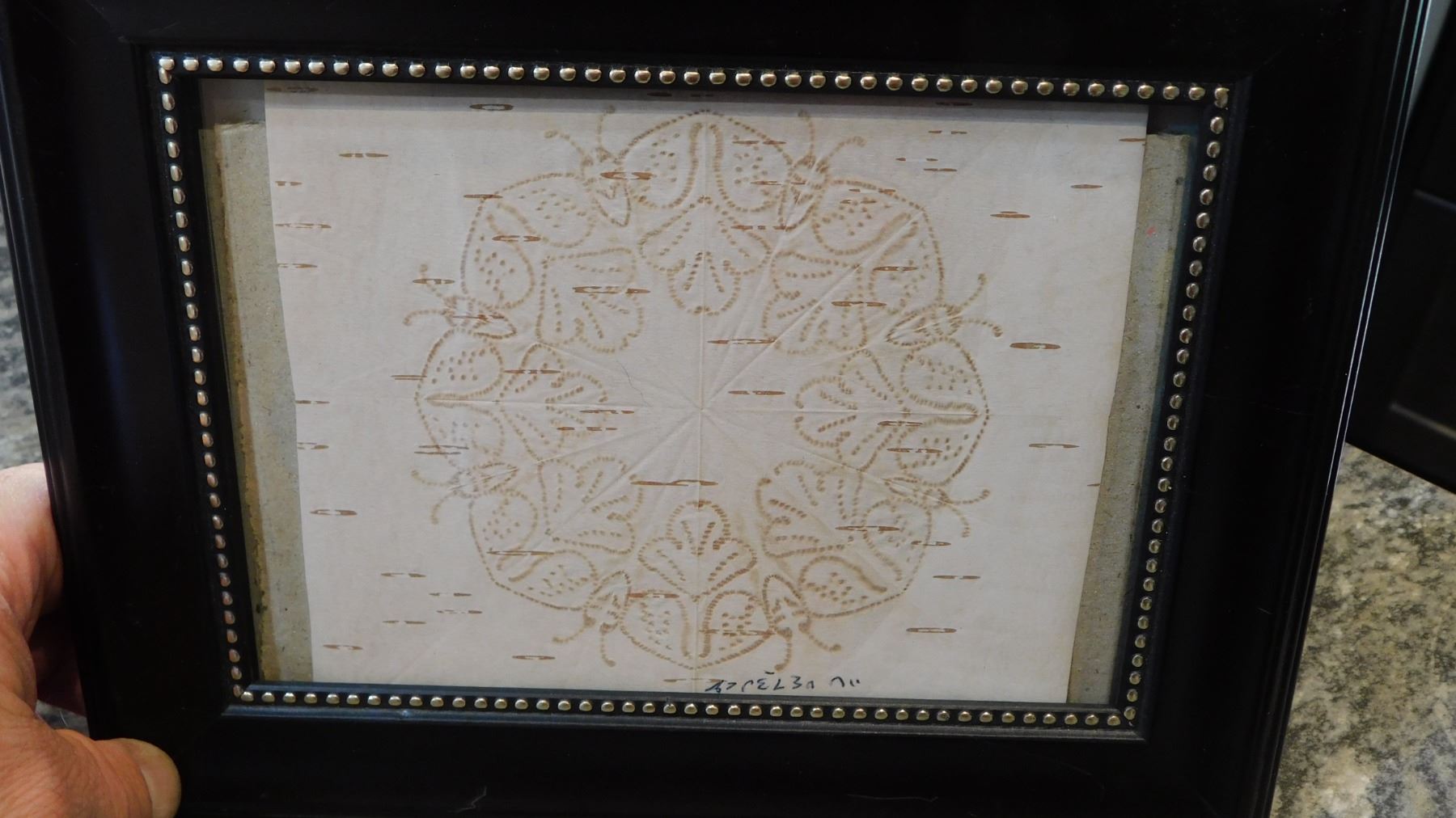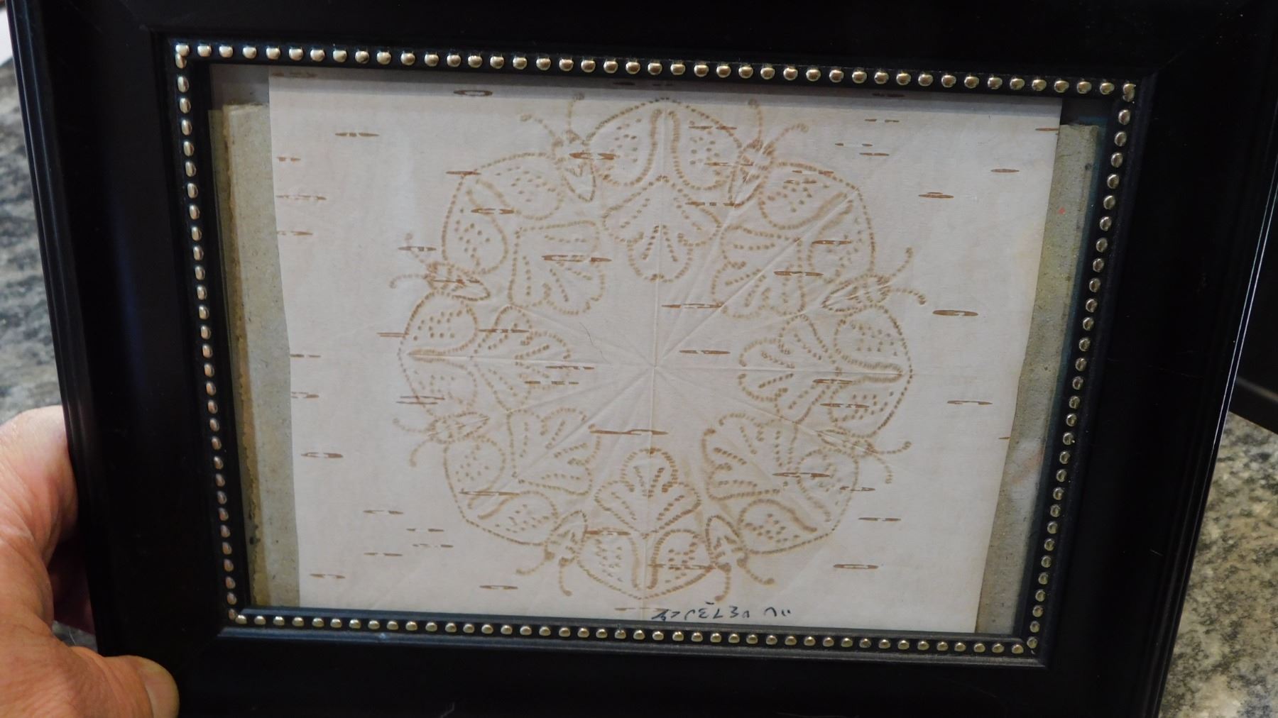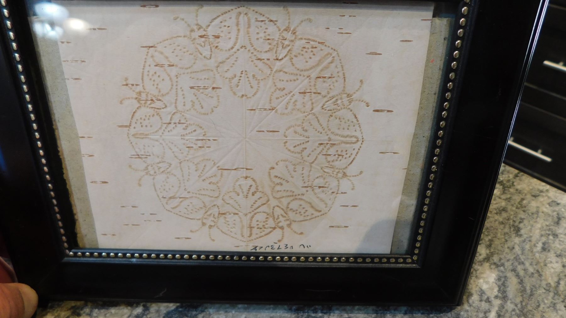 ANGELIQUE MIRASTY SIGNED, BIRCH BARK BITING, 4 ½ X 5 ¾ “, BUTTERFLIES & LEAVES