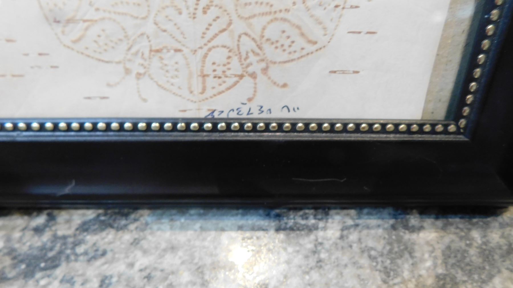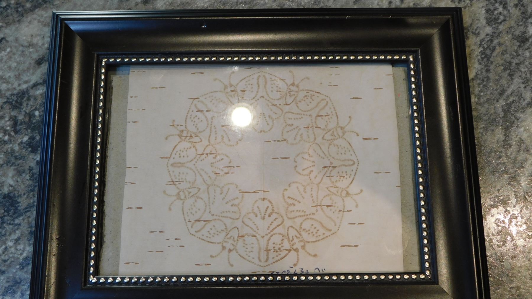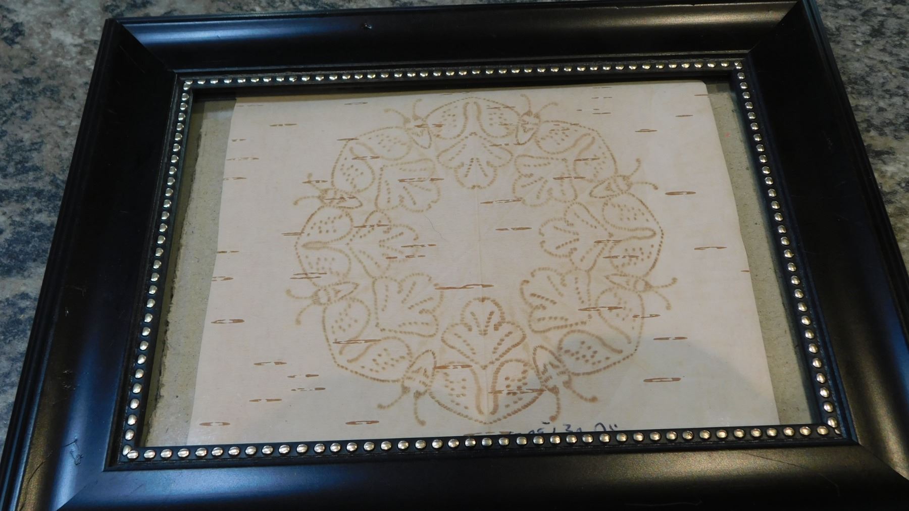 ANGELIQUE MIRASTY SIGNED, BIRCH BARK BITING, 4 ½ X 5 ¾ “, BUTTERFLIES & LEAVES