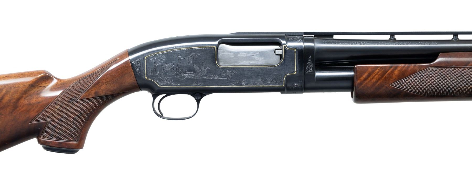ENGRAVING & GOLD BORDERS. Cal. 20 GA, 2 3/4". S# 836527. Bbl. 28" with fixed Mod. choke. Aftermarket small rnd. donut base Simmons vent rib. White target front sight with brass mid bead. Action has the custom hand engraving by former FN master engraver Angelo Bee in the basic 12-5 style with gold borders. Left panel features the standard woodland scene with a pointer and 2 flushing quail. Right panel has a custom pasture scene with 4 flying doves. Highlights of scroll engraving continue to upper and lower receiver areas, as well as trigger guard bow and receiver extension. The receiver extension also has an added pigeon. Custom beavertail forearm and steel capped pistol grip stock of fancy black walnut. The forearm has 2 panel hand checkering. The stock has pigeon style hand checkering. LOP: 14 1/4" over a Winchester buttplate. DAC: 1 9/16". DAH: 2 3/4". Stock has a neutral cast. Mfg. in 1940. CONDITION: near excellent as upgraded, retaining most restored metal finish showing only slight slide wear on the mag. tube. Wood has very good custom refinish. Sound mechanics. Bright near excellent bore. (25-4963/DS). CURIO. $4,500-6,500.