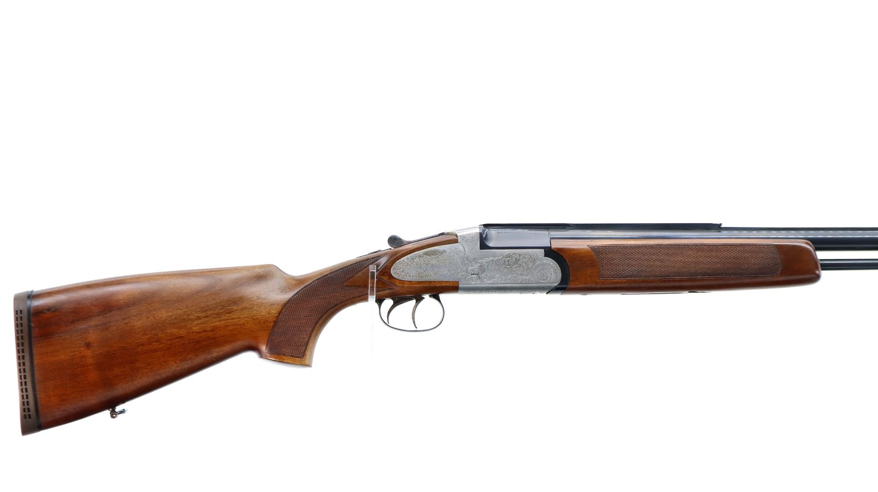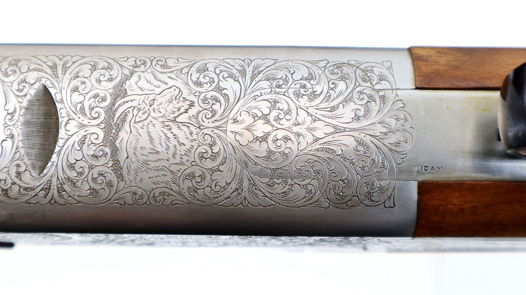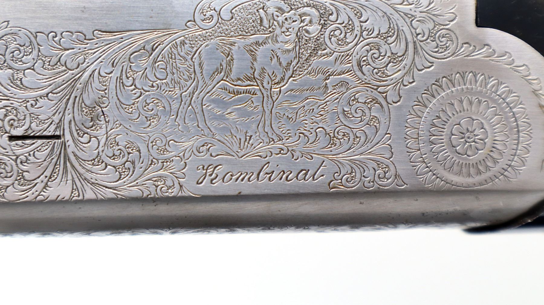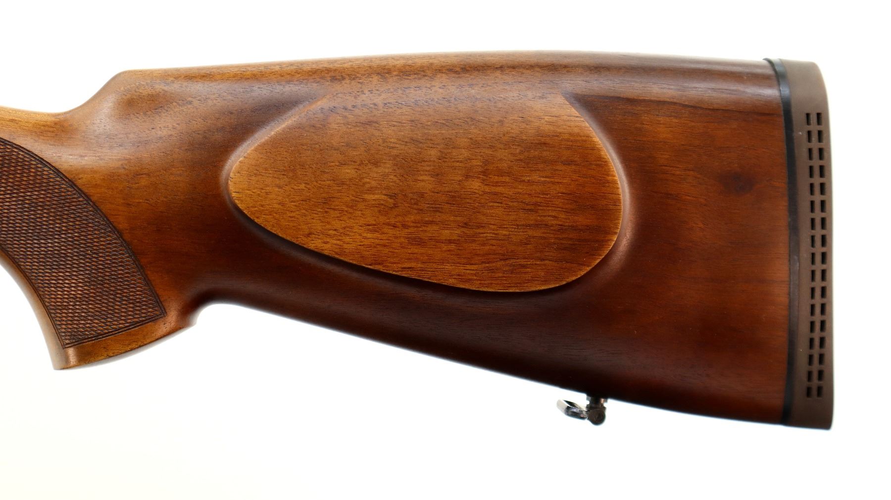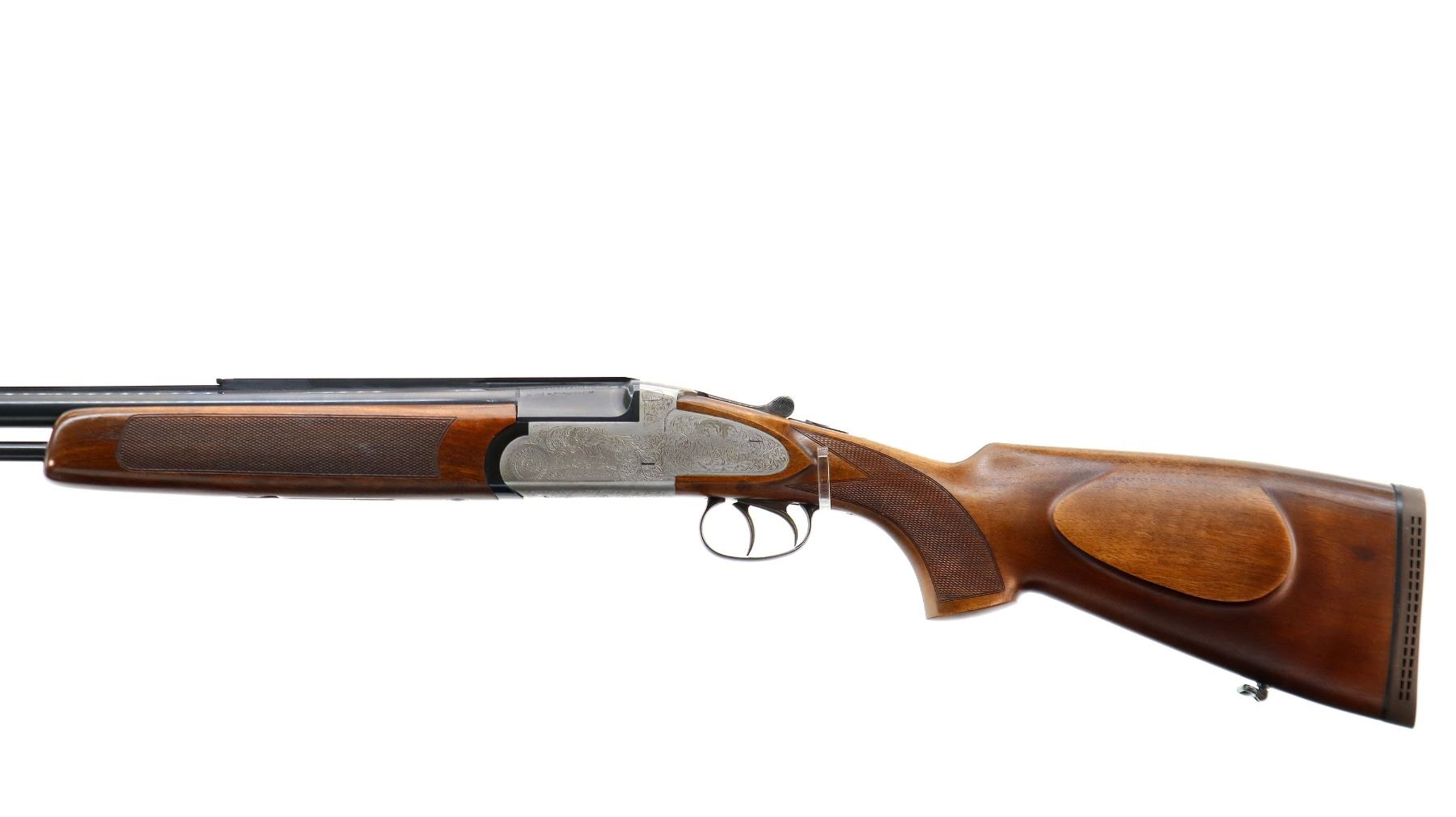 Main Description: Blade front sight with ramp, folding u notched rear sight, blued barrels with solid rib and integral scope base, engraved silver receiver with side plates, manual safety, extractor, double triggers. Two piece Satin finish wood stocks, checkered forearm and pistol grip, European cheek rest, brown vented rubber recoil pad, sling swivels.