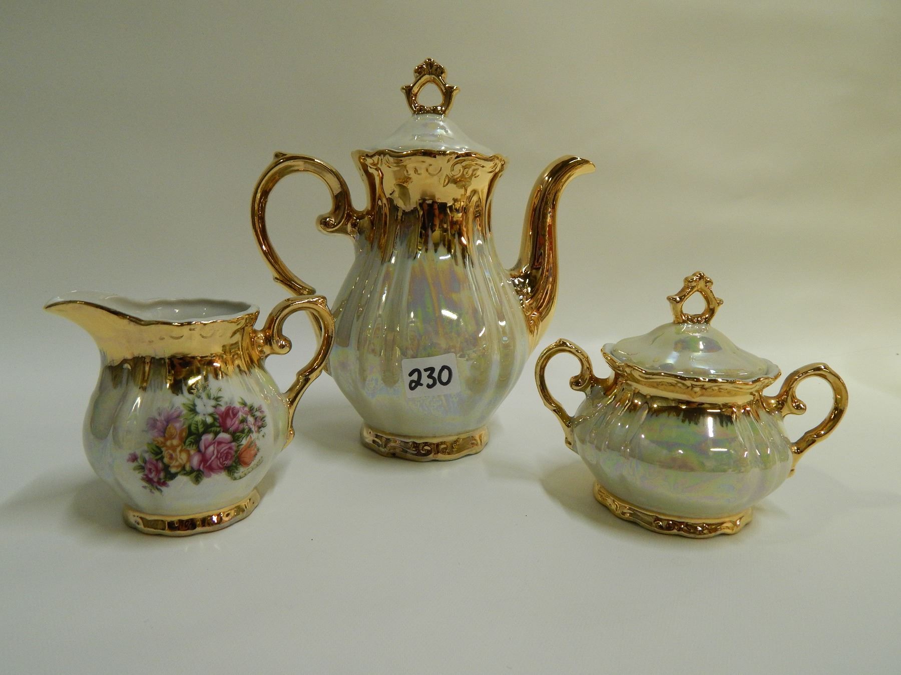 PINK & PURPLE MOTHER OF PEARL GOLD TRIMTEA POT WITH MATCHING CREAM AND SUGAR [JAPAN]