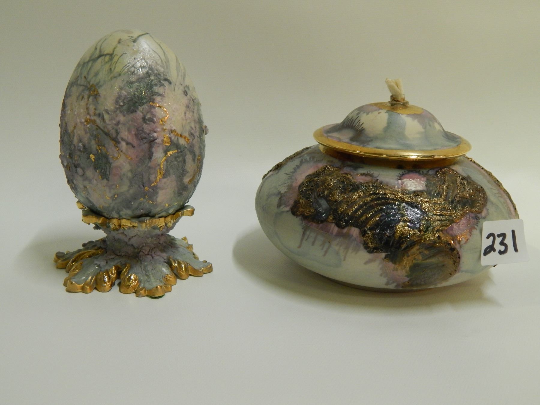 HAND CRAFTED CHERISH PORSELIN EGG AND EGG HOLDER AND OIL BURNING DECANTER