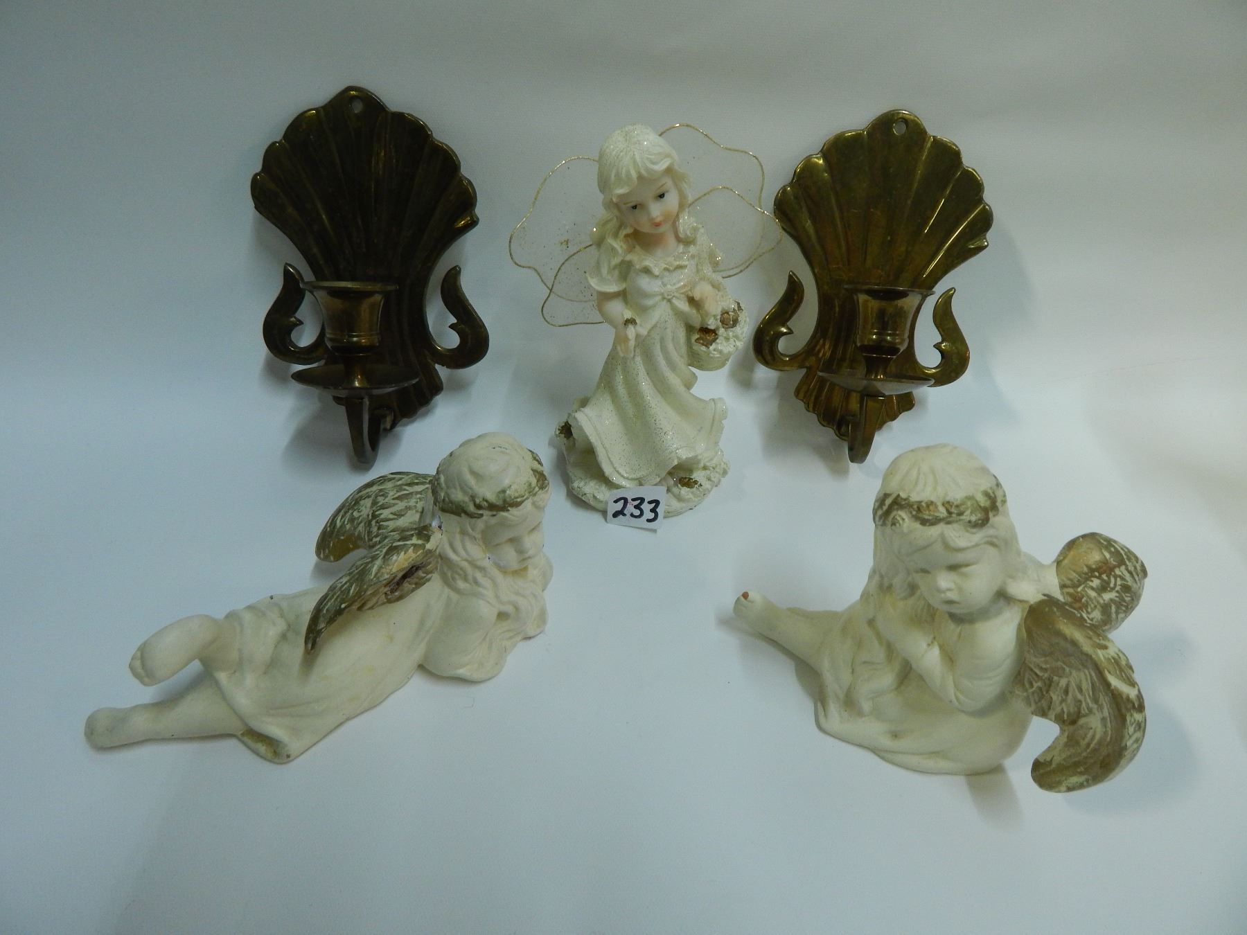 2 BRASS WALL CANDLE HOLDERS/2 ANGELS ONE LAYING DOWN & SITTING UP/ANGEL WITH BASKET OF FLOWERS