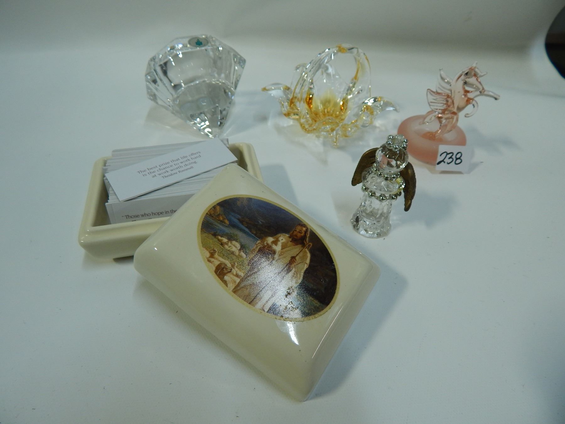 CRYSTAL CANDLE HOLDER/CRYSTAL ANGEL/HAND BLOW SM CANDY DISH/HAND BLOWEN PINK UNICORN/PRAYER BOX
