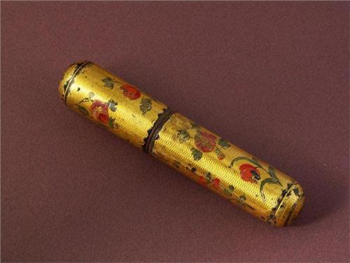 TOBACCIANA: Gilt guilloche-pattern painted cigar holder with a tortoise shell interior case band and polychrome floral exterior painting, measures 5 1/2''L, crack and dent to bottom of case and crack to tortoise shell band noted, wear to paint at exterior.