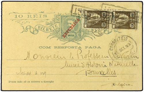 1923 (July 27) 10r+10r stationery reply cards used to Brussels, up-rated with pair of Ceres 1914-26 12c deep brown tied by framed ´PAQUEBOT´ markings in black. Funchal transit (Sept 16). Unusual usage. Scott 136.