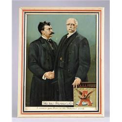 ANHEUSER-BUSCH CARDBOARD SIGN. Illustration of Augustus Busch captioned “The Two Bismarck’s” with Anheuser-Busch logo illustrated in the lower right corner. Circa 1918. Lithographed by Giles Co., New York. SIZE: 14-1/4” w x19-1/4” t. CONDITION: Light surface scuffs, otherwise good to very good. PF 1-3193