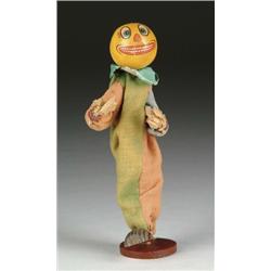ANIMATED FIGURAL PUMPKIN MAN. Animated wood body, cloth dressed, pumpkin man moves when foot is raised. Hands, collar, and clothing are similar to scarecrow attire. SIZE: 8” t. CONDITION: Small dimple in area of mouth; otherwise toy is good overall. WP 1-3703 (700-900)