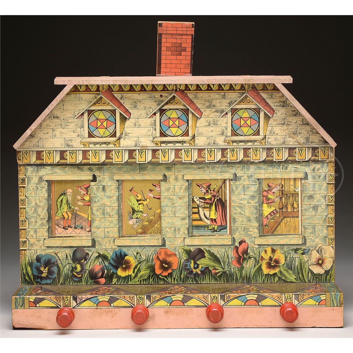 Probably Bliss. Toy shows facade of house with depicted stained glass windows that drop to reveal characters from "Goosey, Goosey Gander" poem. Wonderful images from late 19th century. Amused child would tally score as figures were revealed. SIZE: 17" t. PROVENANCE: The Diane and late Steve Olin collection. CONDITION: Mechanism to back side needs adjustment otherwise paper lithography is very good to near excellent. 13271-3