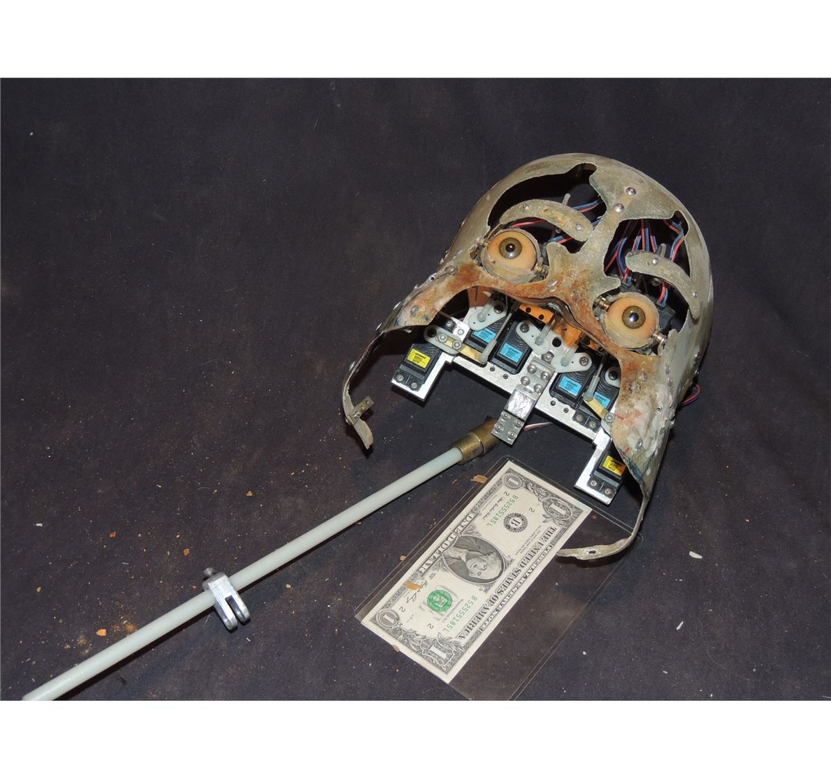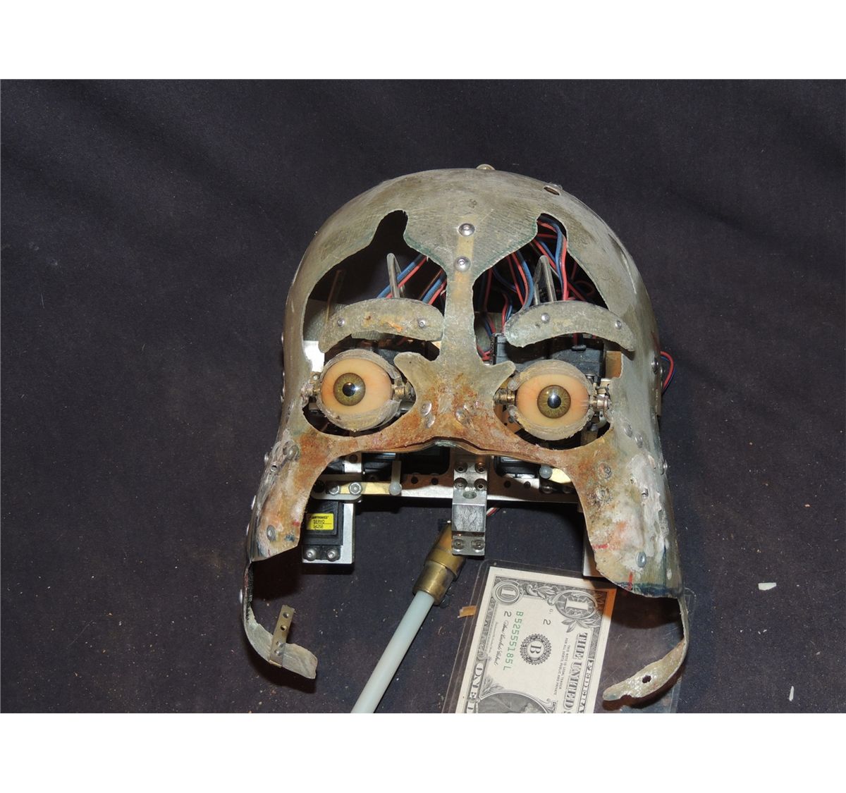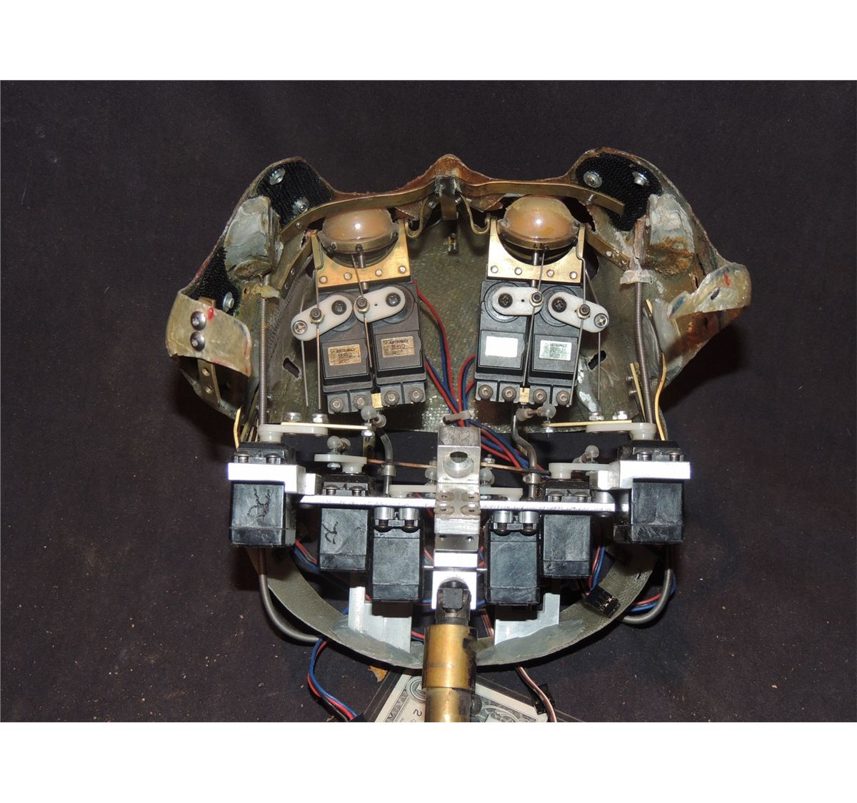 This is a very cool intact animatronic under skull puppet with excellent green eyes. The lower jaw is missing, but all of the main mechanisms, and 10 servos seen in the photos remain intact with no missing plugs.