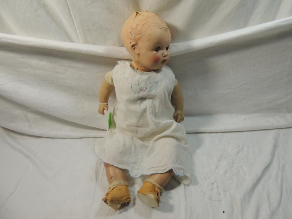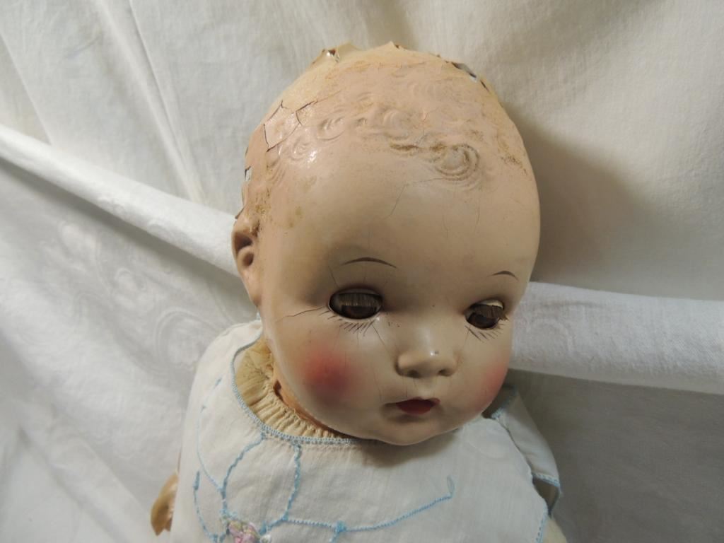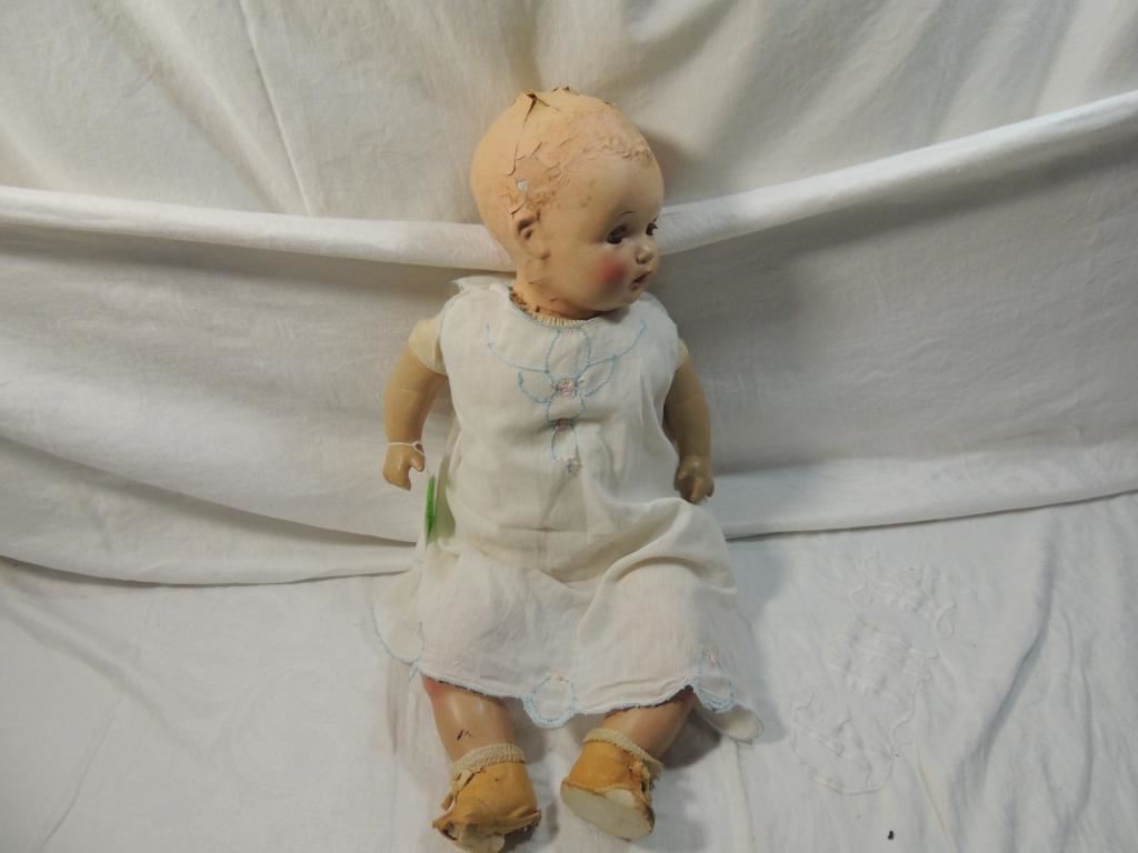 ANTIQUE DOLL, COMPOSITION DOLL, SLEEP EYES, OPEN MOUTH, OPEN CLOSE EYES, VINTAGE DRESS, COLLECTIBLE, AS SHOWN SEE PHOTO FOR MORE DETAILS.