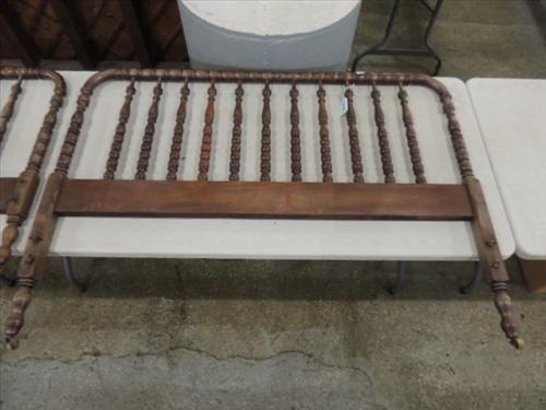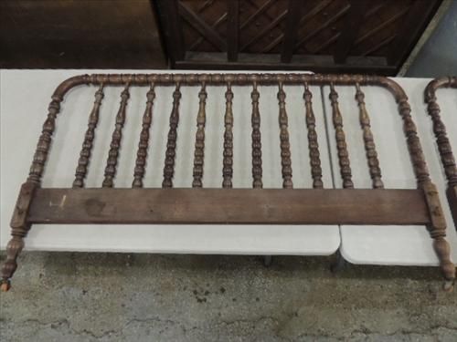 ANITUE MAPLE SPINDLE TURNED BED HEAD & FOOT BOARD. 53" WIDE & WOOD WHEEL CASTORS. AS SHOWN. VIEW PICTURE FOR DETAIL.