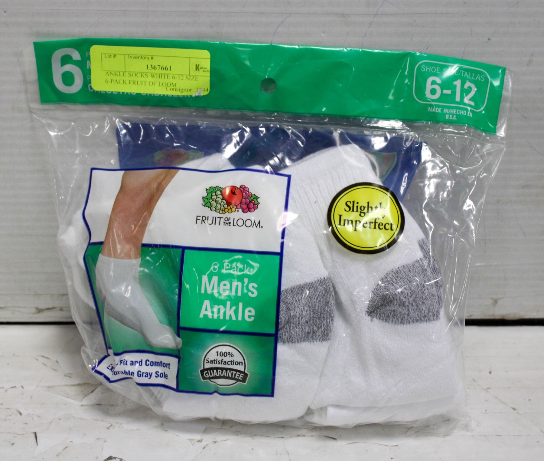 ANKLE SOCKS WHITE 6-12 SIZE 6-PACK FRUIT OF LOOM