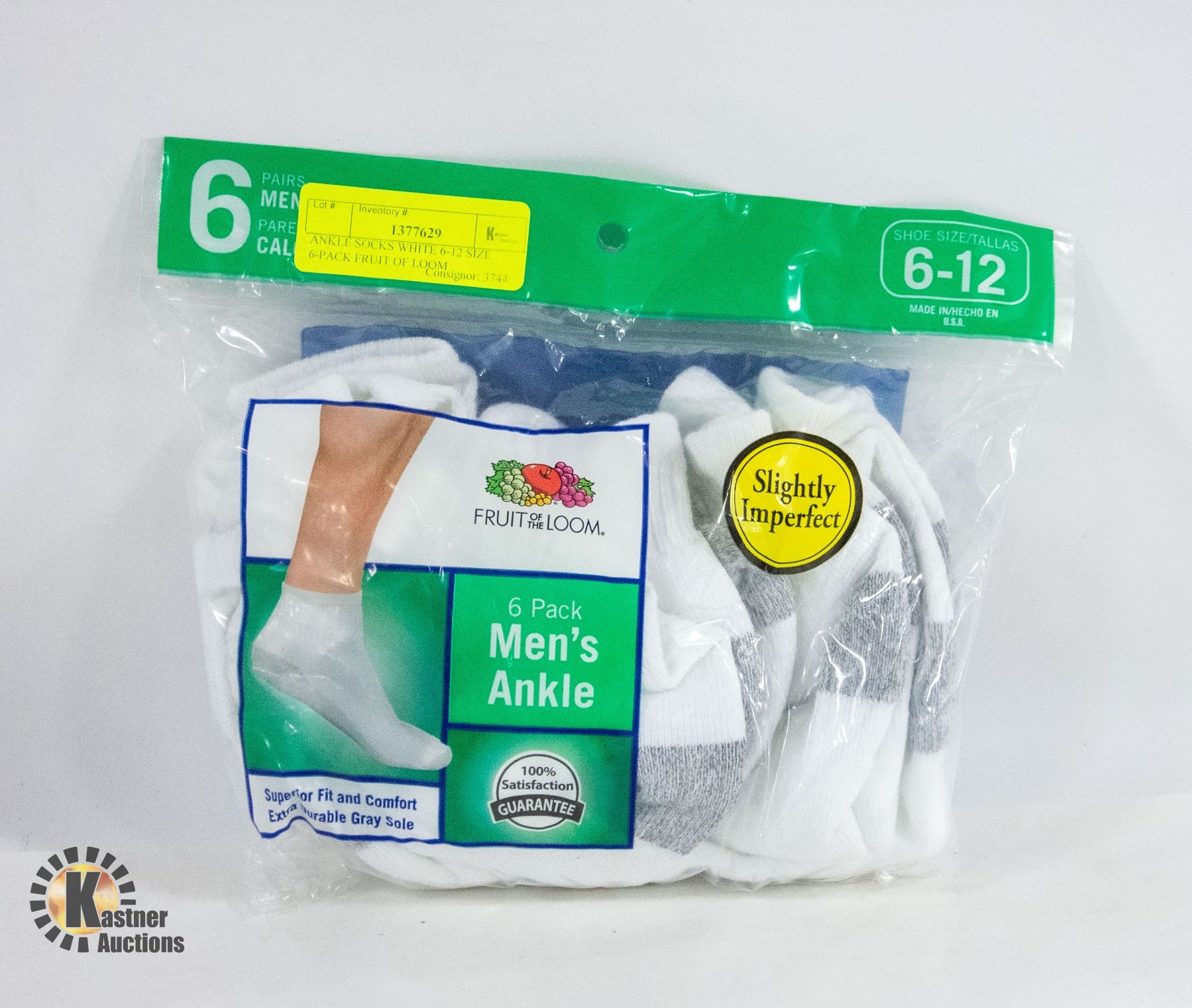ANKLE SOCKS WHITE 6-12 SIZE 6-PACK FRUIT OF LOOM