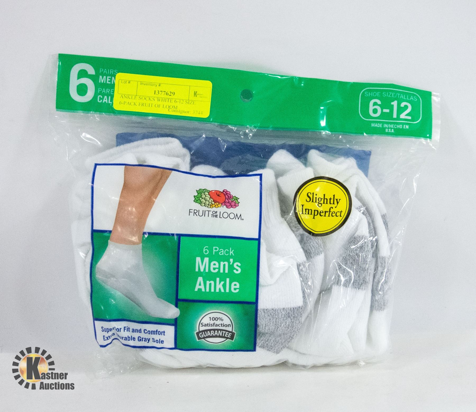 ANKLE SOCKS WHITE 6-12 SIZE 6-PACK FRUIT OF LOOM