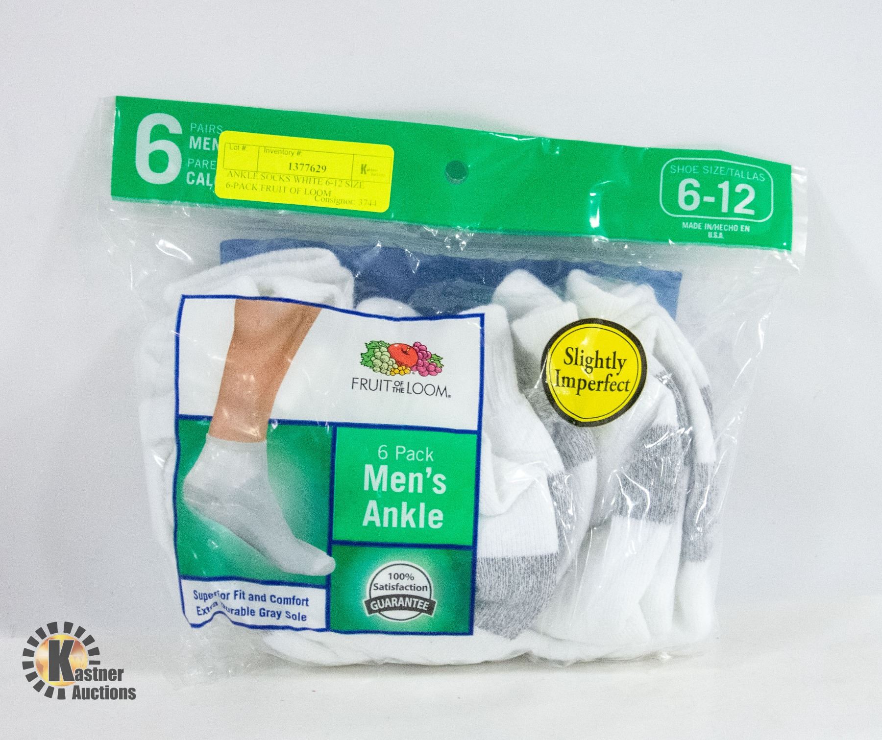 ANKLE SOCKS WHITE 6-12 SIZE 6-PACK FRUIT OF LOOM