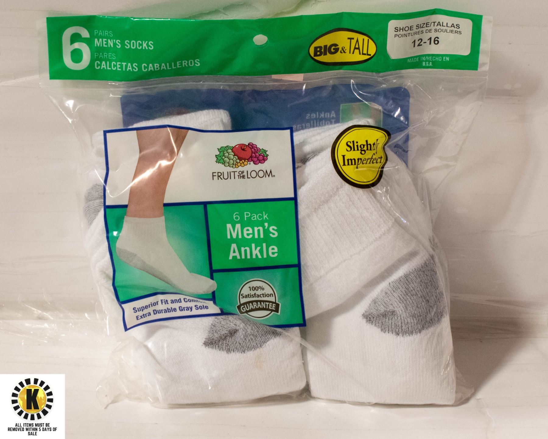ANKLE SOCKS WHITE,SIZE 12-16,6-PACK,FRUIT OF THE