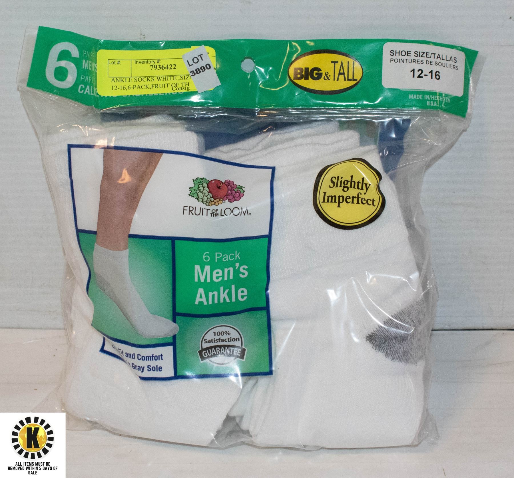 ANKLE SOCKS WHITE ,SIZE 12-16,6-PACK,FRUIT OF THE