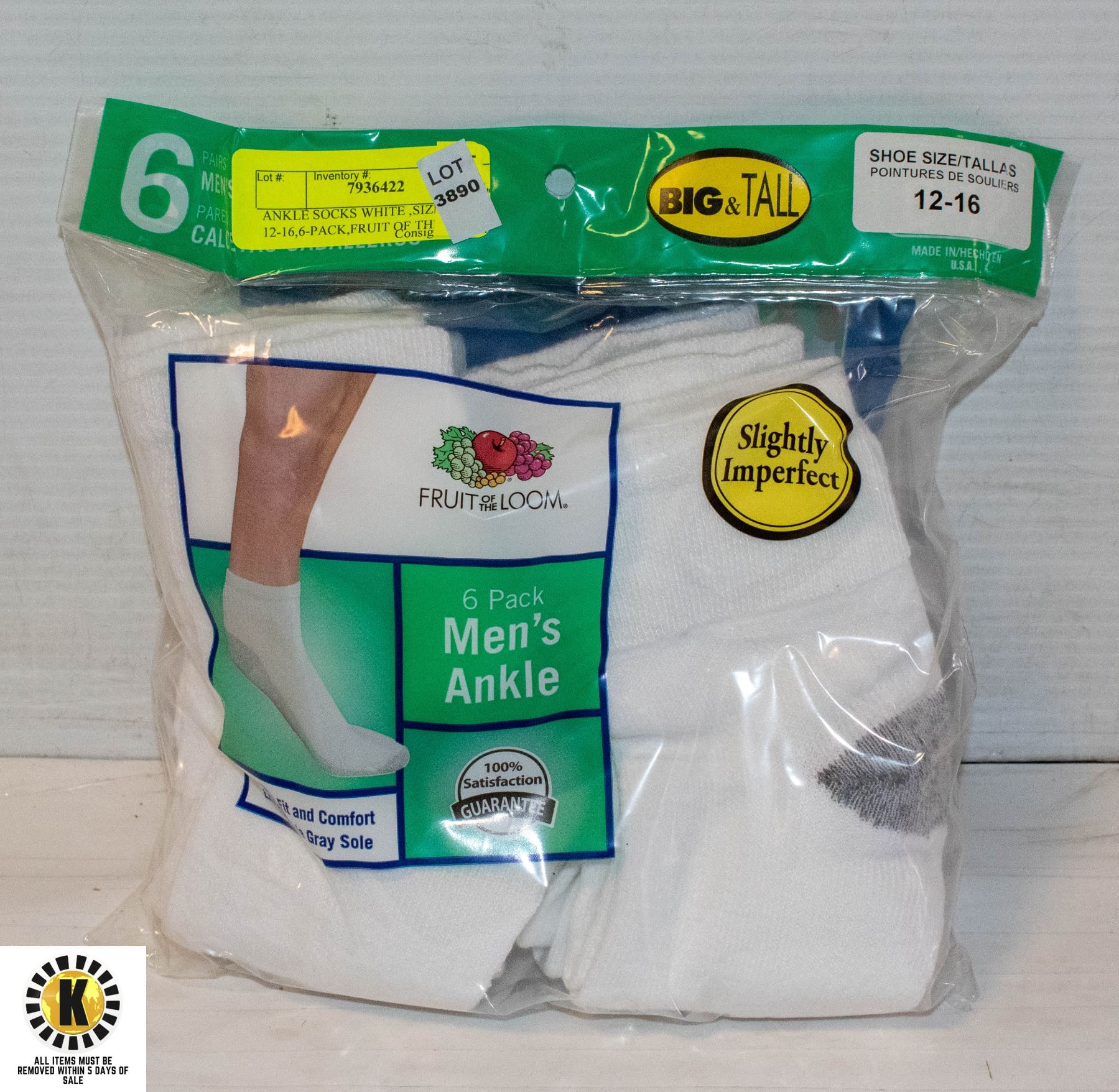 ANKLE SOCKS WHITE ,SIZE 12-16,6-PACK,FRUIT OF THE