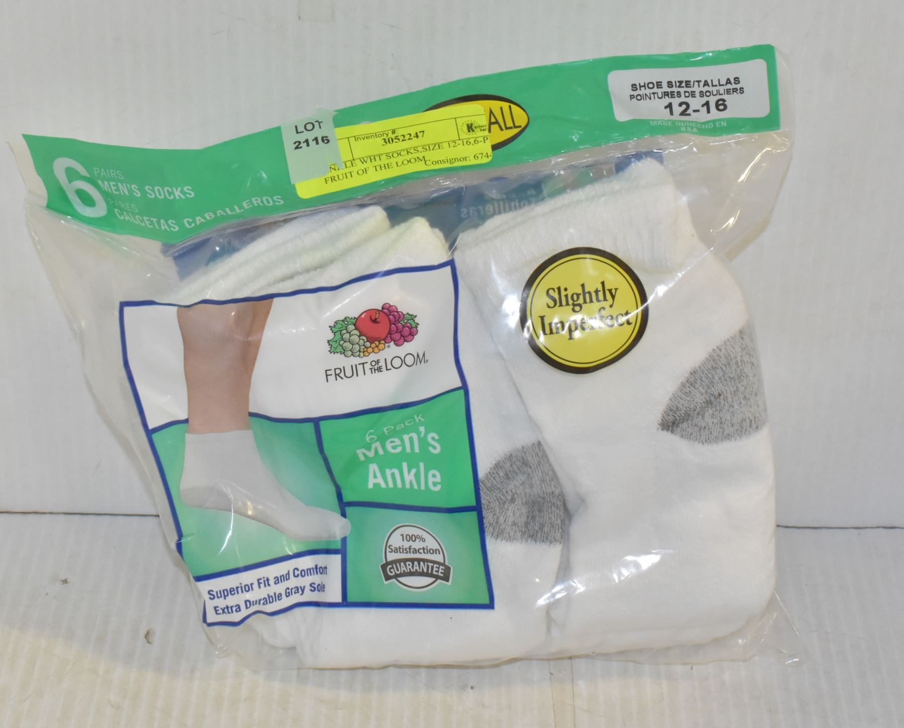 ANKLE WHT SOCKS,SIZE 12-16,6-PK FRUIT OF THE LOOM