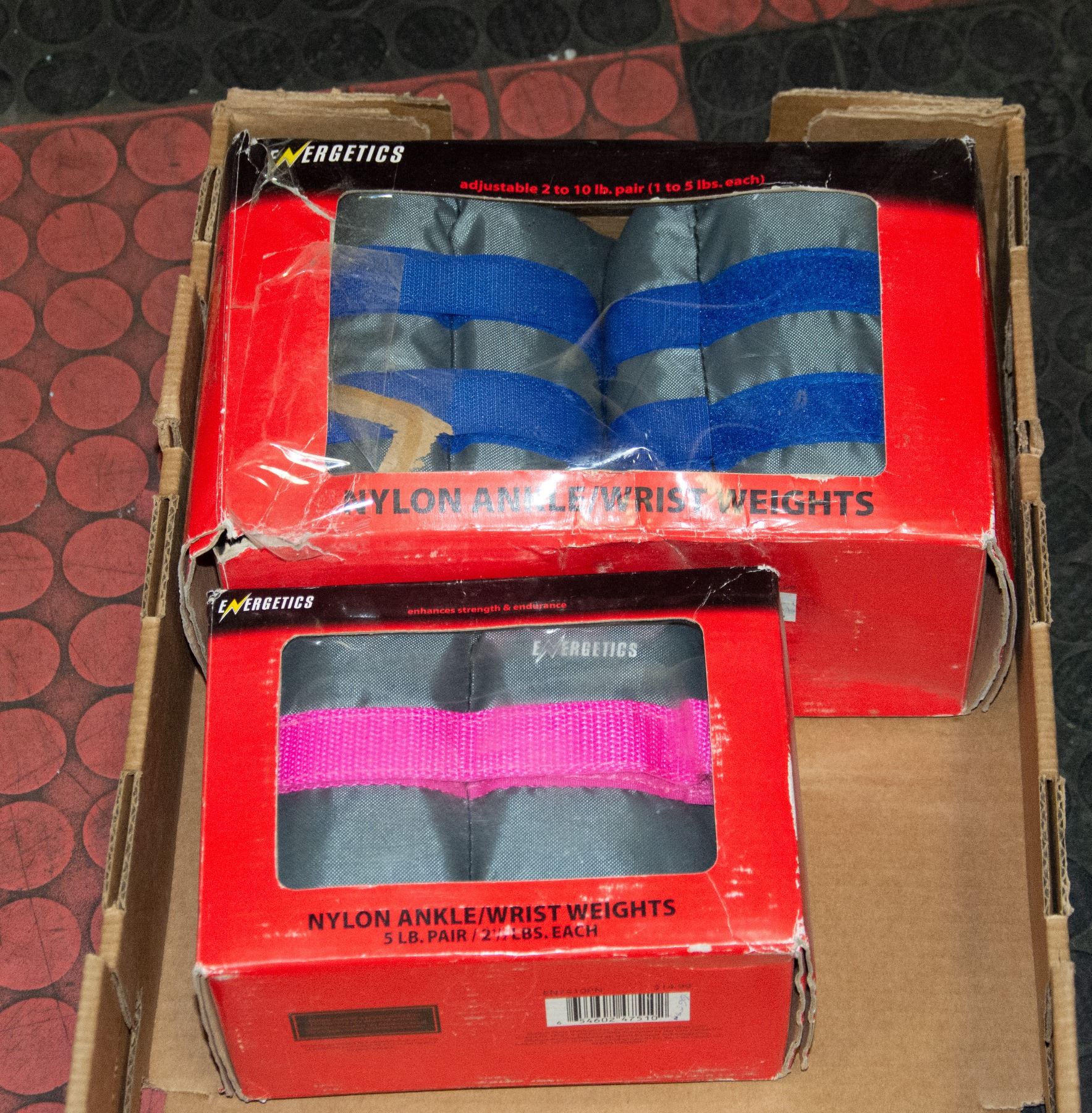 ANKLE/WRIST WEIGHTS. 5 LB PAIR & ADJUSTABLE 10 LB PAIR, PINK BANDED PAIR, BOXES ARE FREIGHT DAMAGED.