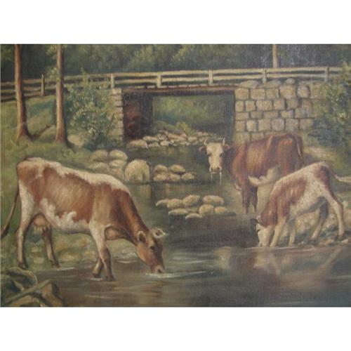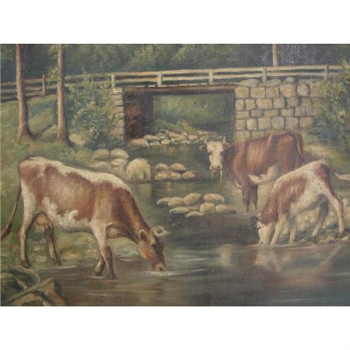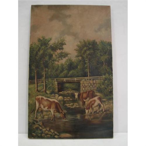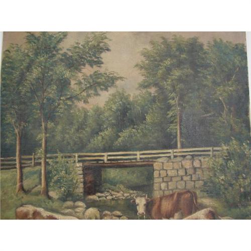 ANNA SOLOMON, AMERICAN, 19th c. OIL ON CANVAS. Landscape with bridge and cattle. 16” x 26”. Signed lower left “Anna Solomon”. Label on reverse: “Foss – Framing Wallpaper Stationery – Auburn, Maine”.