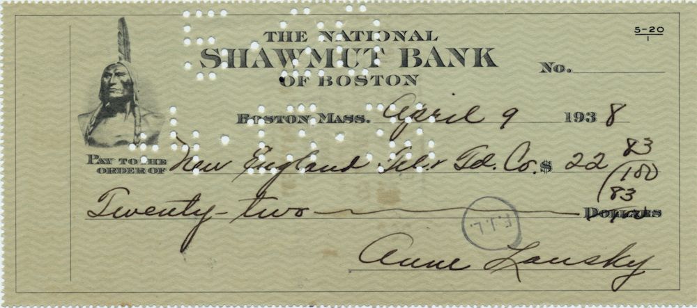 Wife of American mobster Meyer Lansky. Vintage check drawn on The National Shawmut Bank in Boston, engrossed and signed, Apr. 9, 1938. Lansky makes a $22.83 payment to New England Telephone and Telegraph Company. Punch cancels lightly affect engrossment, else very good.