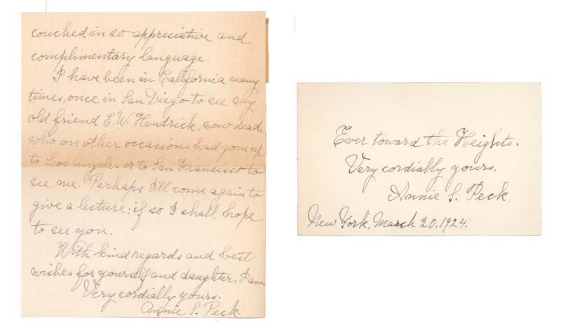 ANNIE SMITH PECK. Mountain climber. Signed card and ALS. 5” x 3 1/4” and 5” x 6 1/2” respectively. March 1924.Mounting trace on verso. Fine.