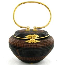 Many weeks of work in this finely, tightly woven Lipao vine handbag, silver plated hardware, silk lined with mirror; 5.5in wide