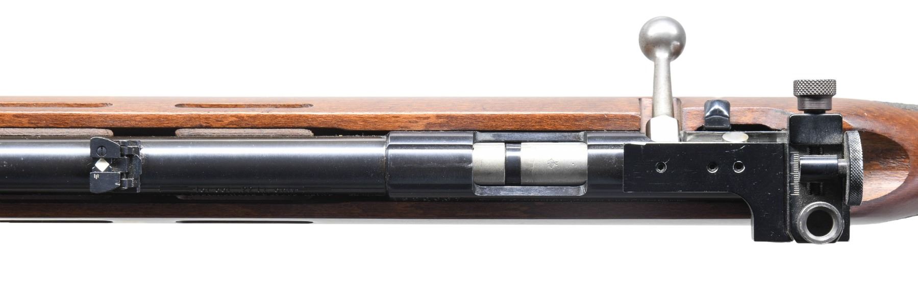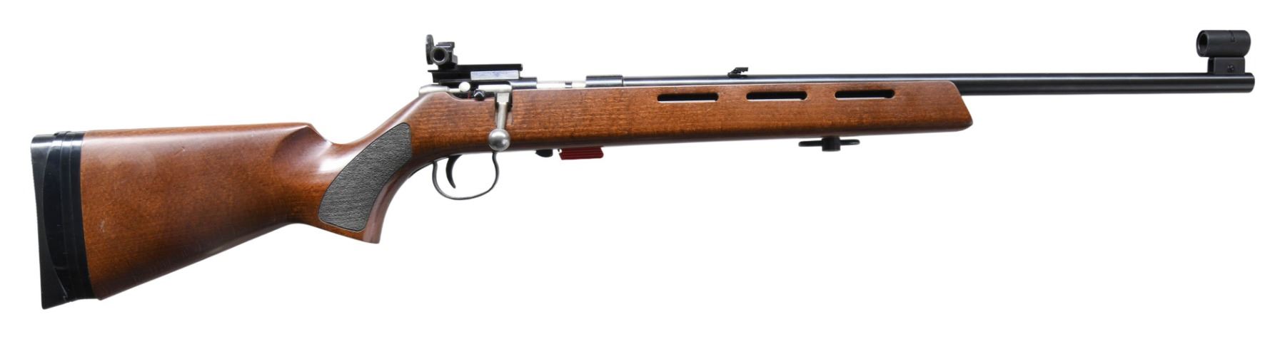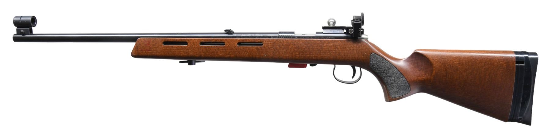Cal. 22 LR. S# 1320007. Bbl. 19.5" tapering .740" to .640" having grooved muzzle end with globe sight; Williams target receiver sight mounted to natural aluminum adapter that is attached to grooved receiver plus folding leaf sight on rear of barrel. "IH" barrel code indicates mfg. 1987 (imported 1987-1995). Its walnut stained hardwood stock has vent slots and sling swivel on forend (2 extra mounting position holes), stippled pistol grip panels plus black adjustable buttplate of rubber and plastic. Two stage target trigger. Grooved receiver and standard sized bolt knob. MAGS: 1 red factory single shot loading platform. CONDITION: some extremely faint handling marks on stock set plus minor finish loss on sling swivel and receiver sight; all other aspects near excellent including bore. (25-3355/NW). MODERN. $250-400.