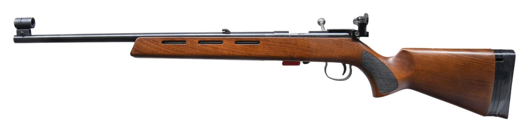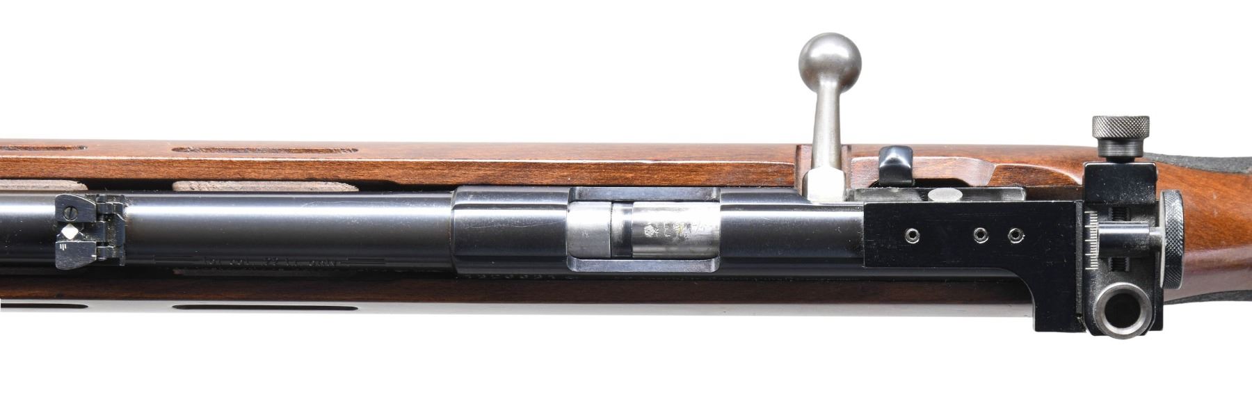 Cal. 22 LR. S# 1326631. Bbl. 19.5" tapering .740" to .640" having grooved muzzle end with globe sight; Williams target receiver sight mounted on grooved receiver plus folding leaf sight at rear of barrel. "IH" barrel code indicates mfg. 1987 (imported 1987-1995). Its walnut stained hardwood stock has vent slots and accessory rail on forend, stippled pistol grip panels plus black adjustable buttplate of rubber and plastic. Two stage target trigger. Grooved receiver and standard sized bolt knob. Rack number "11" on right side of buttstock. MAGS: 1 red factory single shot loading platform. CONDITION: light handling marks on stock set; balance is near excellent including bore. (25-3358/NW). MODERN. $250-400.