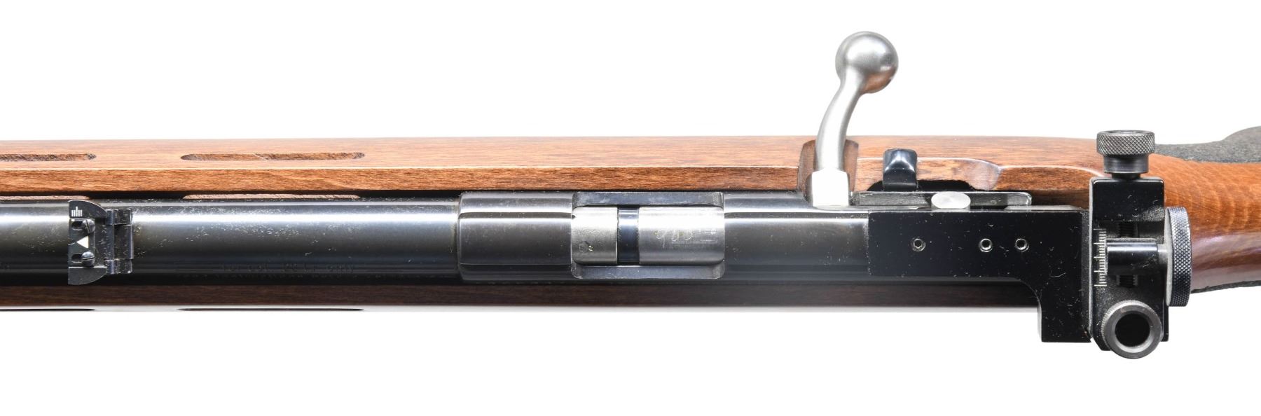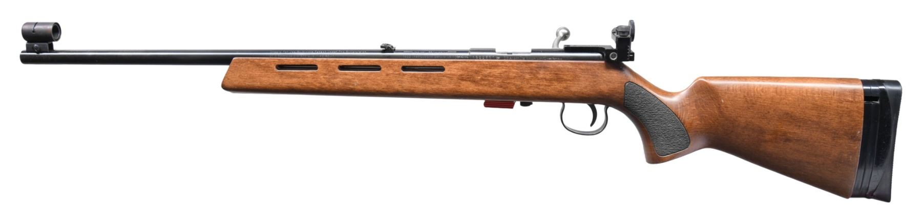 Cal. 22 LR. S# 1399631. Bbl. 19.5" tapering .740" to .640" having grooved muzzle end with globe sight; Williams target receiver sight mounted on grooved receiver plus folding leaf sight at rear of barrel. "KD" barrel code indicates mfg. 1993 (imported 1987-1995). Its walnut stained hardwood stock has vent slots and accessory rail on forend, stippled pistol grip panels plus black adjustable buttplate of rubber and plastic. Two stage target trigger. Grooved receiver and standard sized bolt knob. Rack number "13" on right side of buttstock. MAGS: 1 red factory single shot loading platform. CONDITION: light handling marks on stock set; balance is near excellent including bore. (25-3360/NW). MODERN. $250-400.