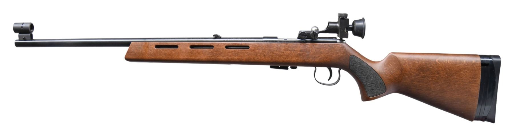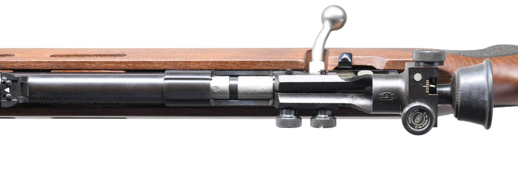 Cal. 22 LR. S# 1398770. Bbl. 19.5" tapering .740" to .640" having grooved muzzle end with globe sight; factory target receiver sight mounted on grooved receiver plus folding leaf sight at rear of barrel. "KD" barrel code indicates mfg. 1993 (imported 1987-1995). Its walnut stained hardwood stock has vent slots and accessory rail on forend, stippled pistol grip panels plus black adjustable buttplate of rubber and plastic. Two stage target trigger. Grooved receiver and standard sized bolt knob. MAGS: 1 factory 5 rd. CONDITION: slight dried lubricant in action; appears new and unfired. (25-3719/NW). MODERN. $250-400.