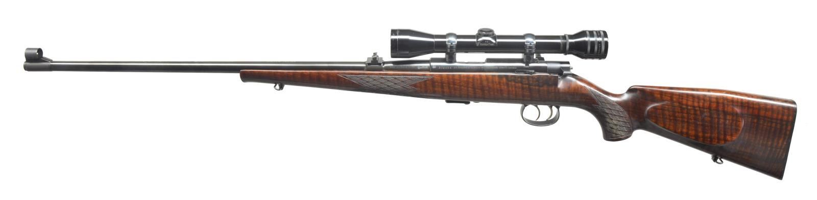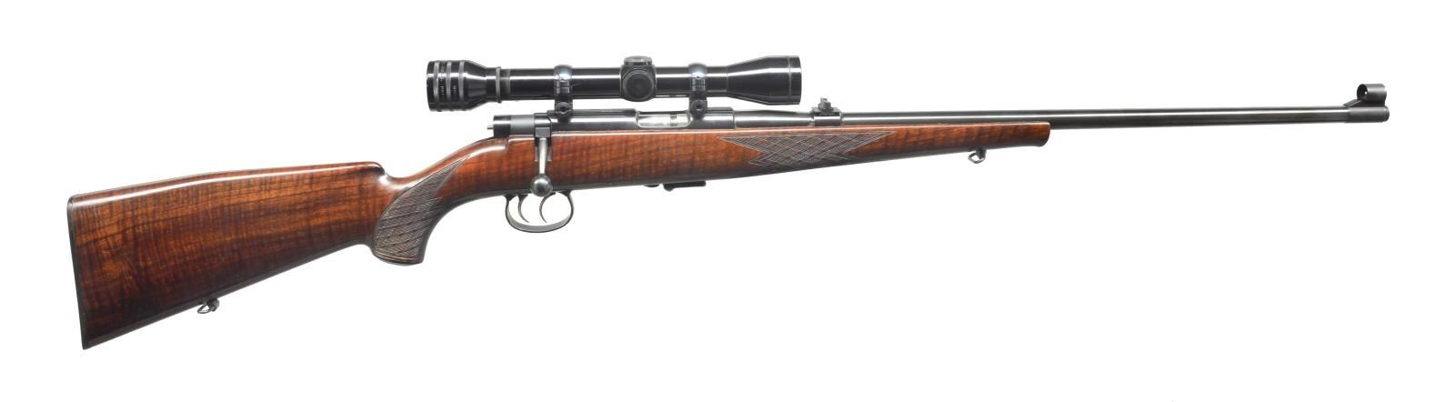 & SCOPE. Cal. 22 LR. S# 339484. Bbl. 23" marked “ANCHUTZ – MOD 1422” on top is fitted w/ 3 leaf rear sight & white bead front in short sleeved on ramp w/ hood. Typical Anschutz action marked w/ maker’s name & address on left side. Top is grooved for scope mount. Rifle is fitted w/ detachable 5 rd. box mag. & dbl. set triggers. Truly superb “Meistergrade" stock of full length closely fiddle figured, fancy European walnut measures 14 1/2" over hard rubber buttplate. Stock features slight hog back to comb, right hand cheekpiece, sling loops, sm. schnabled forend, hard rubber grip cap & skip line point pattern checkering at grip & forend. Rifle is mounted w/ Redfield 4x scope in 22 type tipoff rings. MAGS: 1- box 5 rd. CONDITION: very fine, close to “as new” w/ some light handling & assembly marks mostly in wood, most notably some light scratches on right side of butt. Bright bore, mechanically crisp. Scope is fine w/ some scratches at front, optically clear. (20-4090/MGM). MODERN. $1,200-1,800.