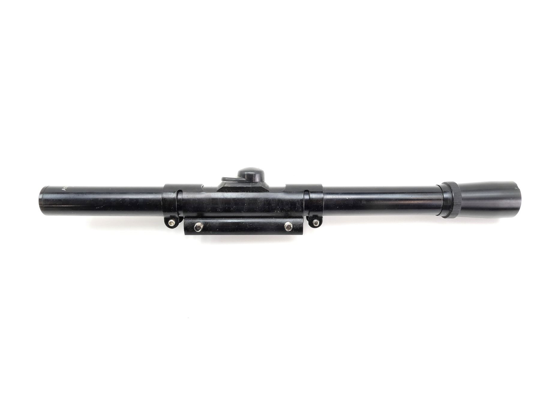 (1) CLEAR OPTICS, GERMAN #1 RETICLE, 0.75" DIAMETER TUBE, WORKING MAGNIFICATION RING, WINDAGE & ELEVATION KNOBS TURN, WITH MOUNTING BASE, SHOWS WEAR & TEAR / USE MARKS. SEE PHOTOS.