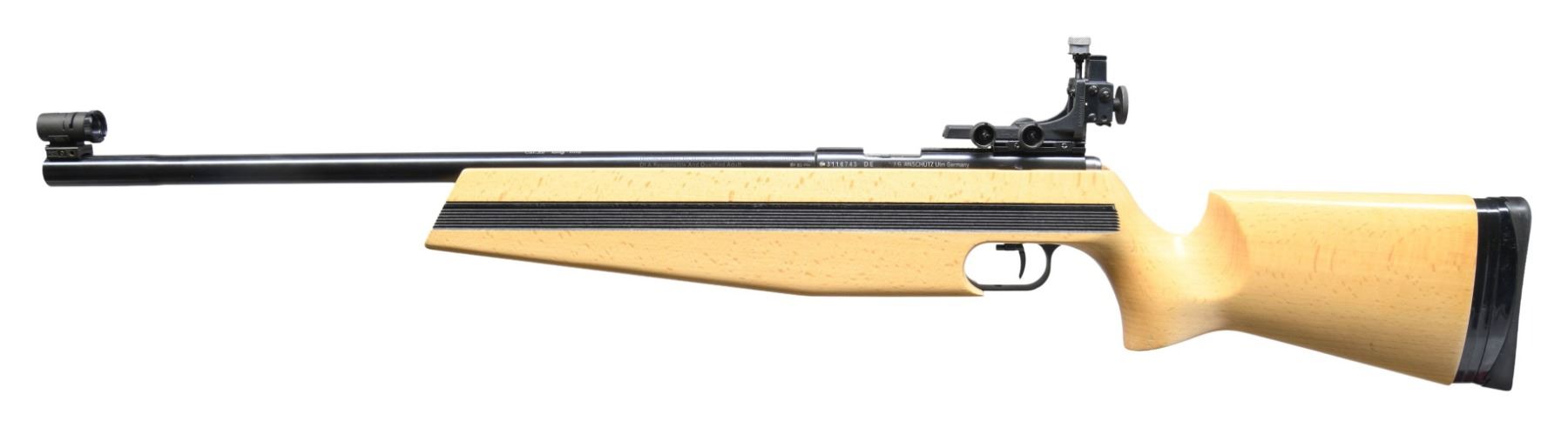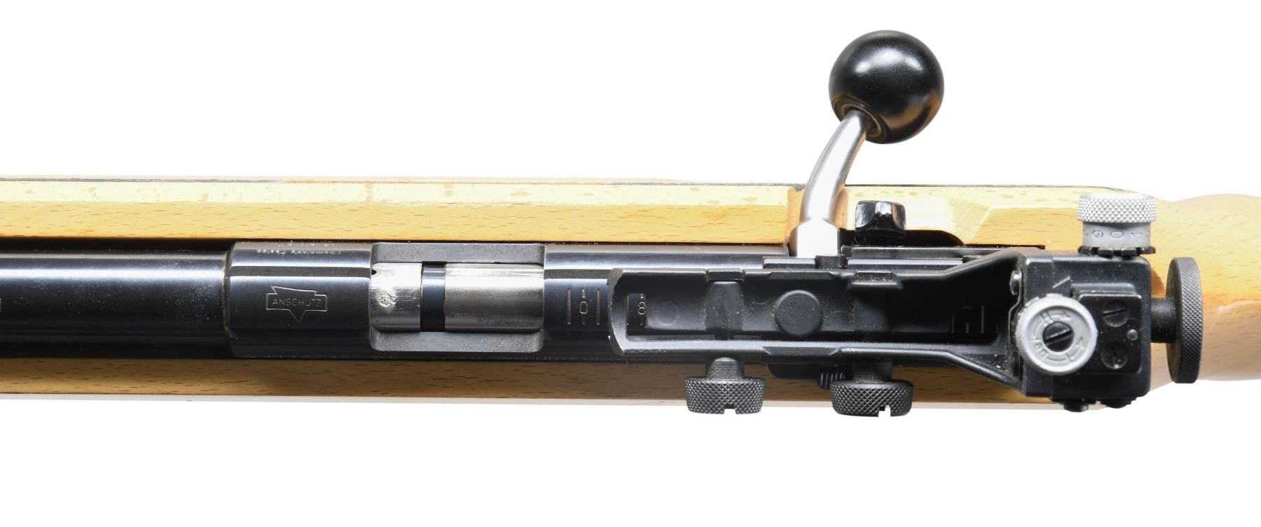 RIFLE. Cal. 22 LR. S# 3116743. Bbl. 21.4" heavy .810" bull target having recessed target crown plus grooves holding Anschutz globe sight; factory receiver sight mounted on grooved receiver. Mfg. 2012 (barrel code "BC") as youth model distributed by Champion Choice. Single shot action with large black bolt knob of Biathlon style. Light colored hardwood stock with dark decorative horizontal grooves on sides. Has forend accessory rail and adjustable black rubber and plastic buttplate assembly. Two stage trigger with position adjustment and light target pull. Rack number "17" on right side of butt. CONDITION: stock has some very light handling marks and a rack number; all other aspects are near excellent including bore. (25-3351/NW). MODERN. $550-750.