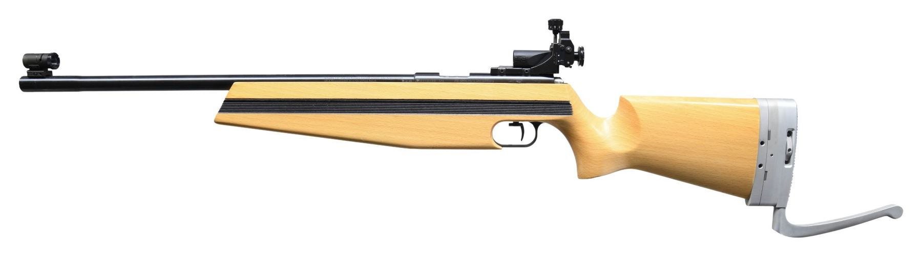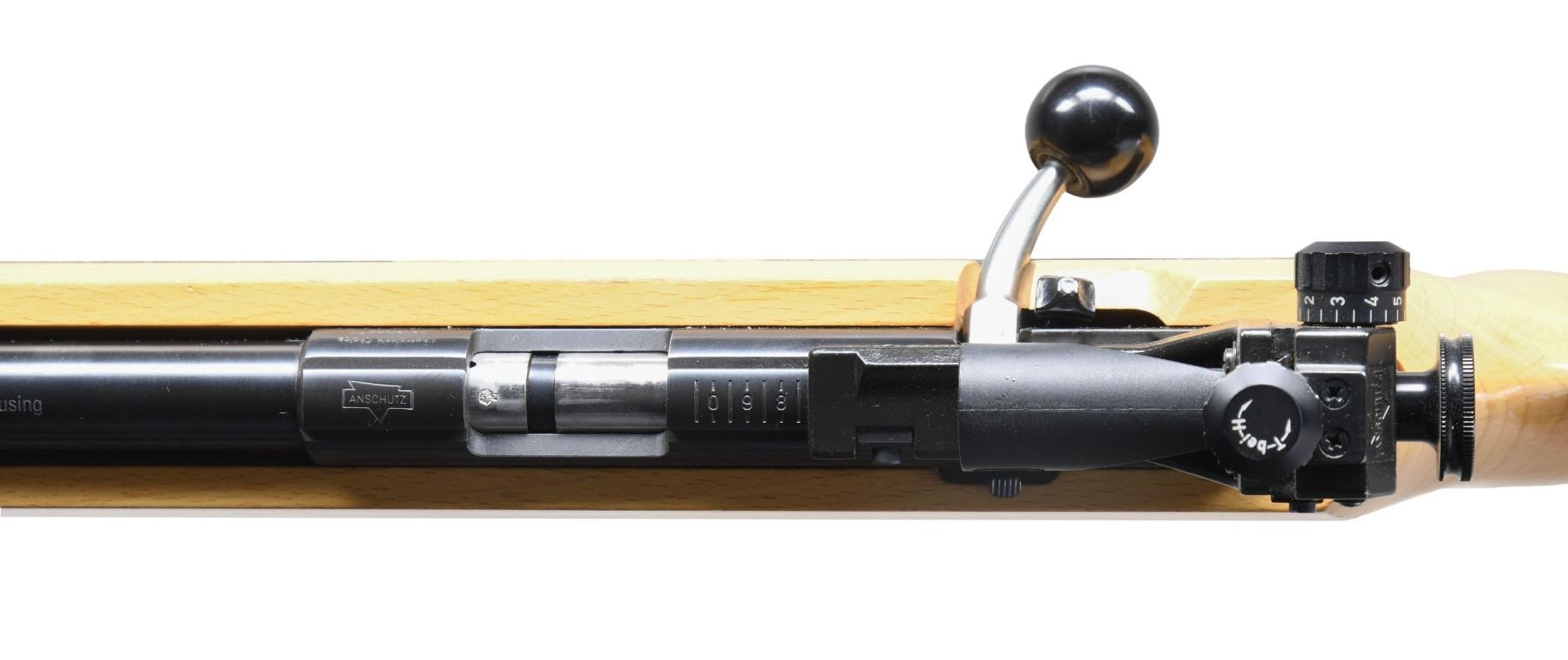 RIFLE. Cal. 22 LR. S# 3115788. Bbl. 21.4" heavy .810" bull target having recessed target crown plus grooves holding Anschutz globe sight; factory receiver sight mounted on grooved receiver. Mfg. 2012 (barrel code "BC") as youth model distributed by Champion Choice. Single shot action with large black bolt knob of Biathlon style. Light colored hardwood stock with dark decorative horizontal grooves on sides. Has forend accessory rail and adjustable aluminum buttplate with hook. Two stage trigger with position adjustment and light target pull. Rack number "16" on right side of butt. CONDITION: stock has some very light handling marks and a rack number; all other aspects are near excellent including bore. (25-3352/NW). MODERN. $600-800.