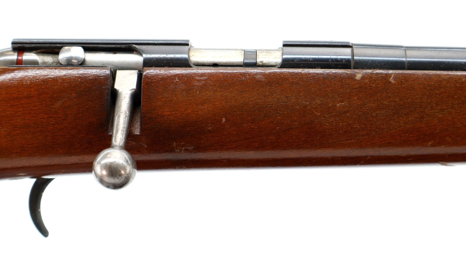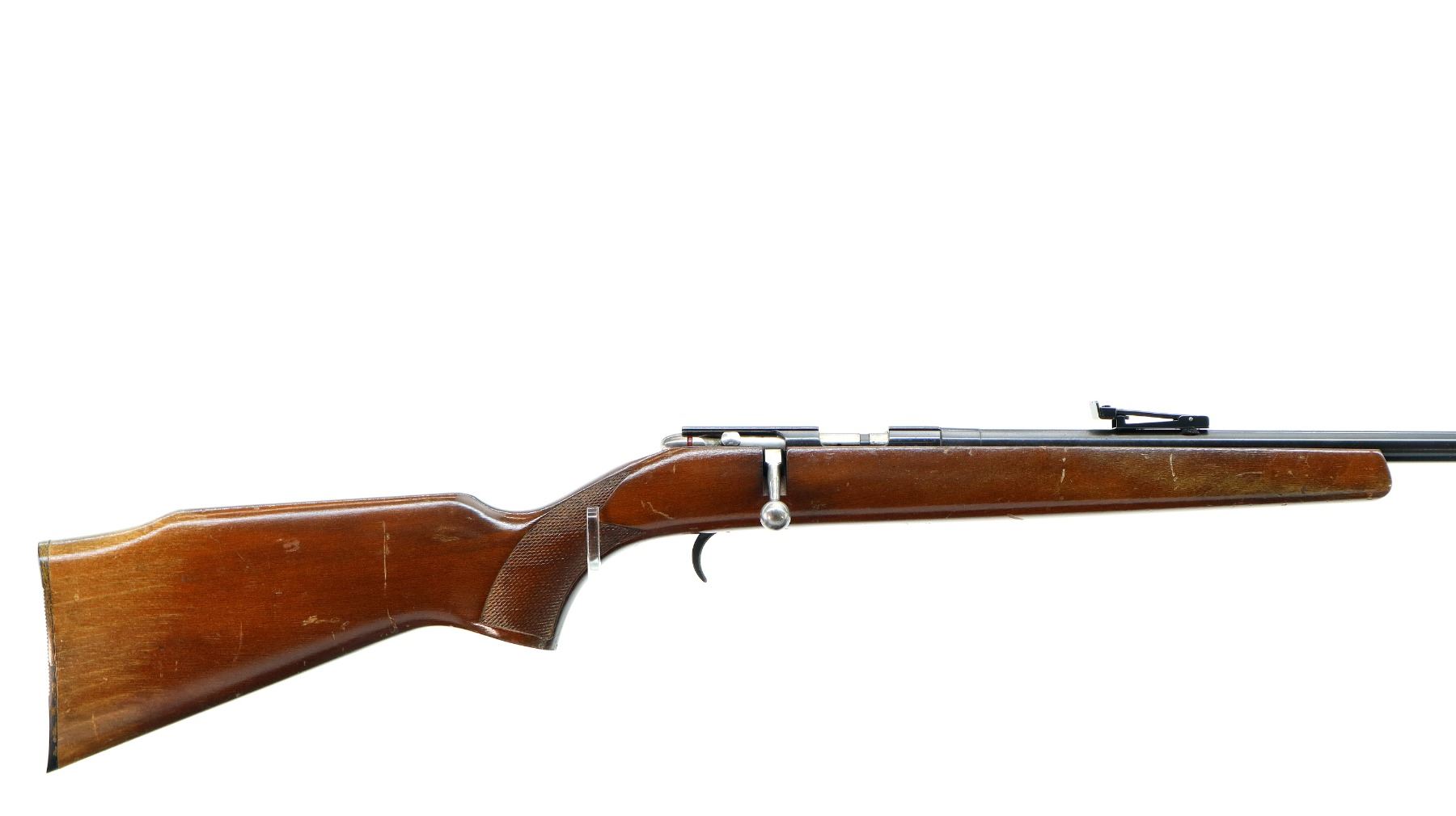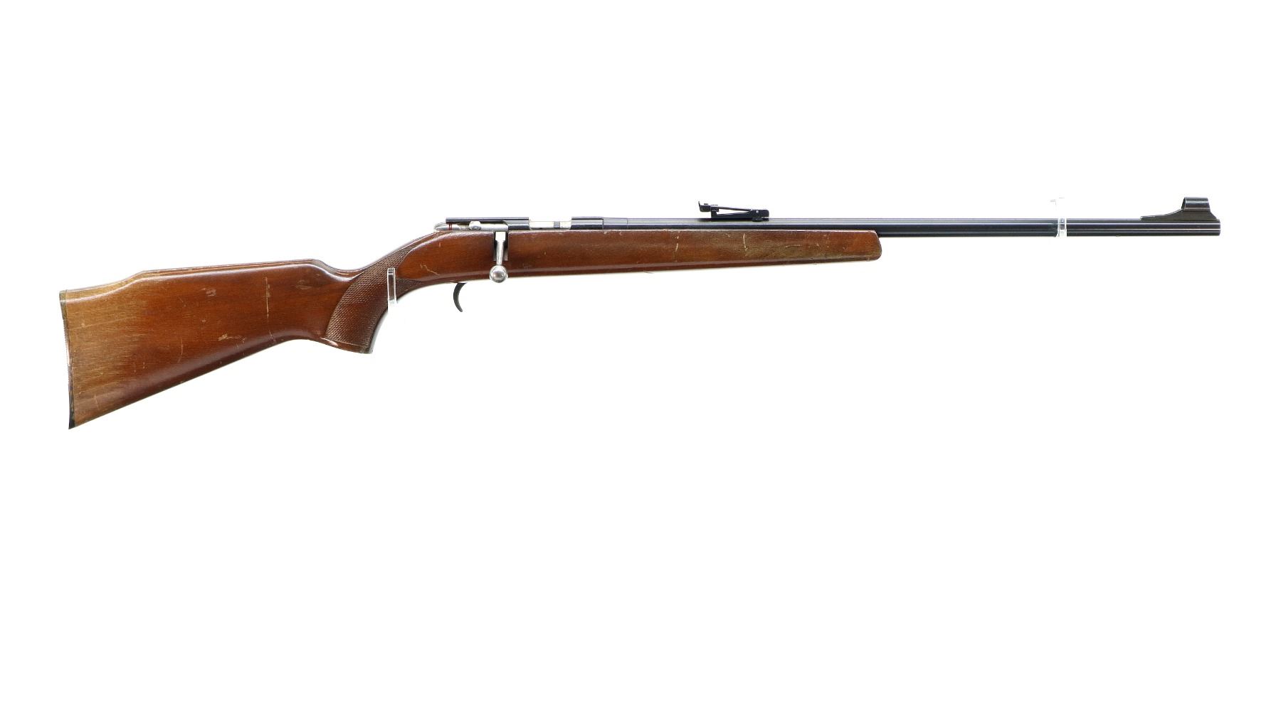 Main Description: Post front sight with hood and ramp, adjustable u notched rear sight, blued finish, grooved receiver, smooth bolt knob, missing magazine catch/parts and trigger guard with screws. One piece wood stock, checkered pistol grip, grooved black polymer butt plate. This rifle has a rebated bore with short length of rifling.