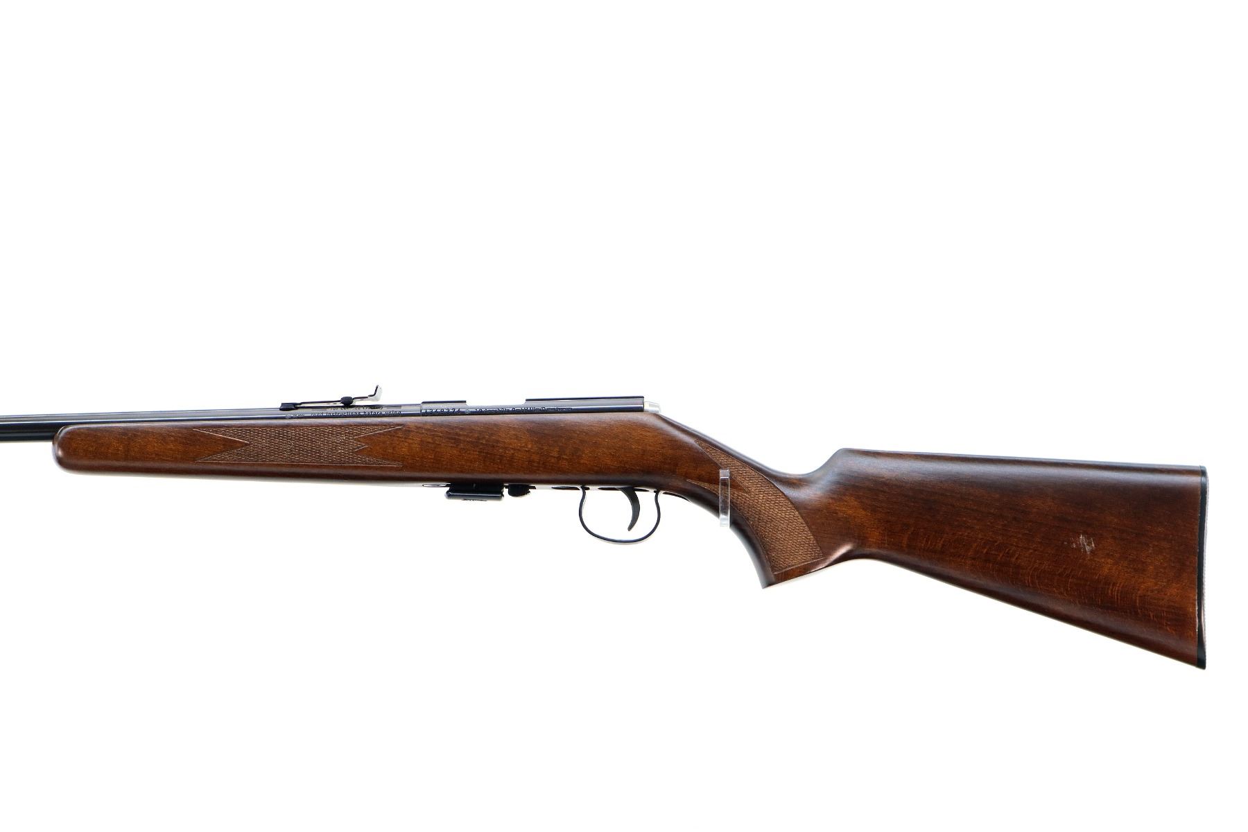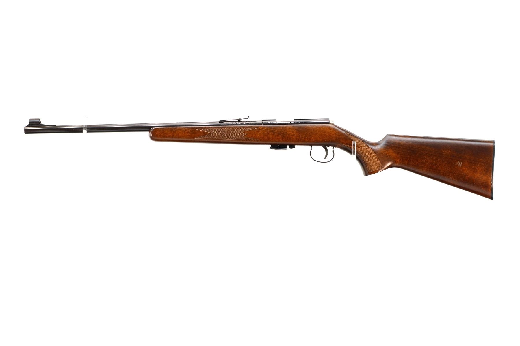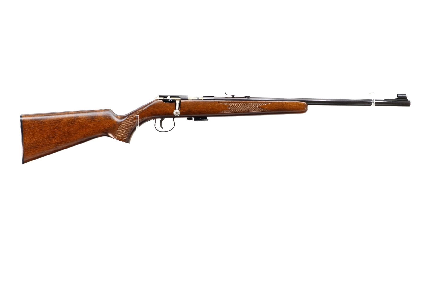 Main Description: Post front sight with hood and ramp, adjustable u notched rear sight, blued finish, grooved receiver, smooth bolt knob. One piece wood stock, checkered forearm, pistol grip and black polymer butt plate.