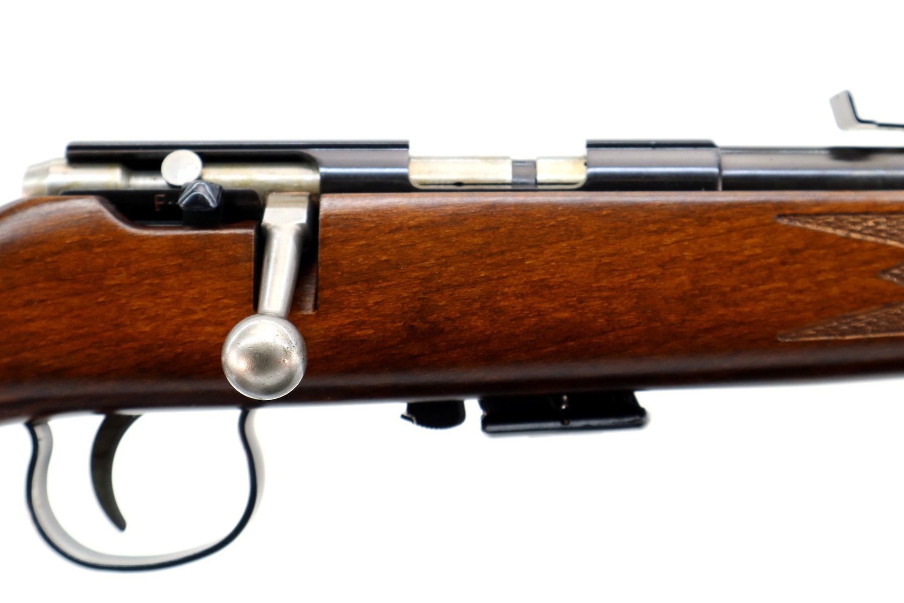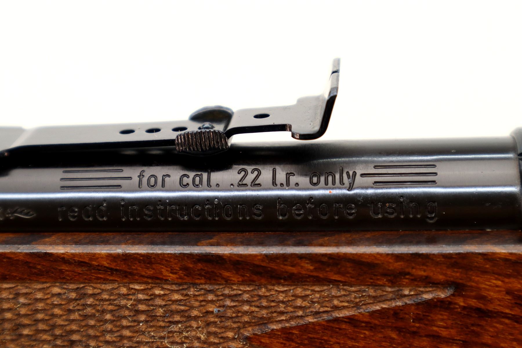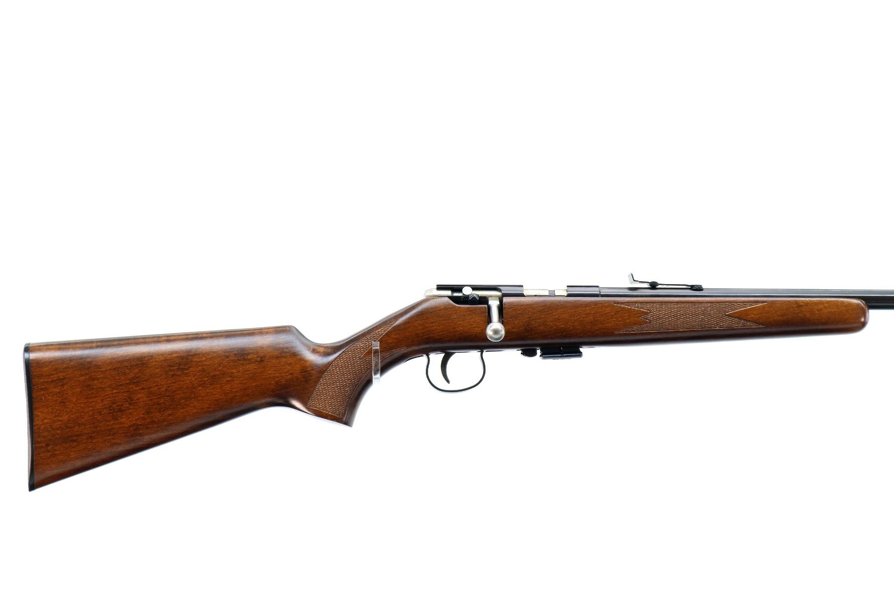 Main Description: Post front sight with hood and ramp, adjustable u notched rear sight, blued finish, grooved receiver, smooth bolt knob. One piece wood stock, checkered forearm, pistol grip and black polymer butt plate.
