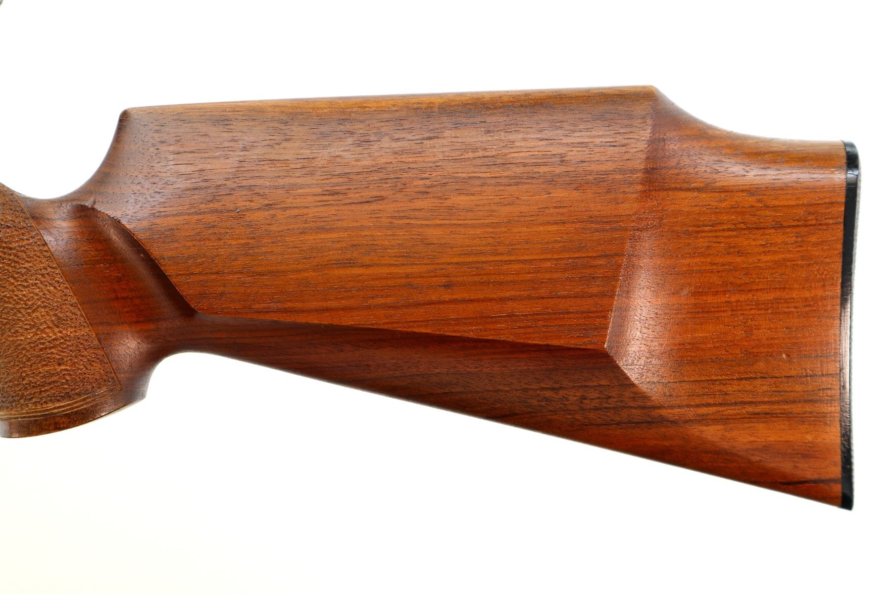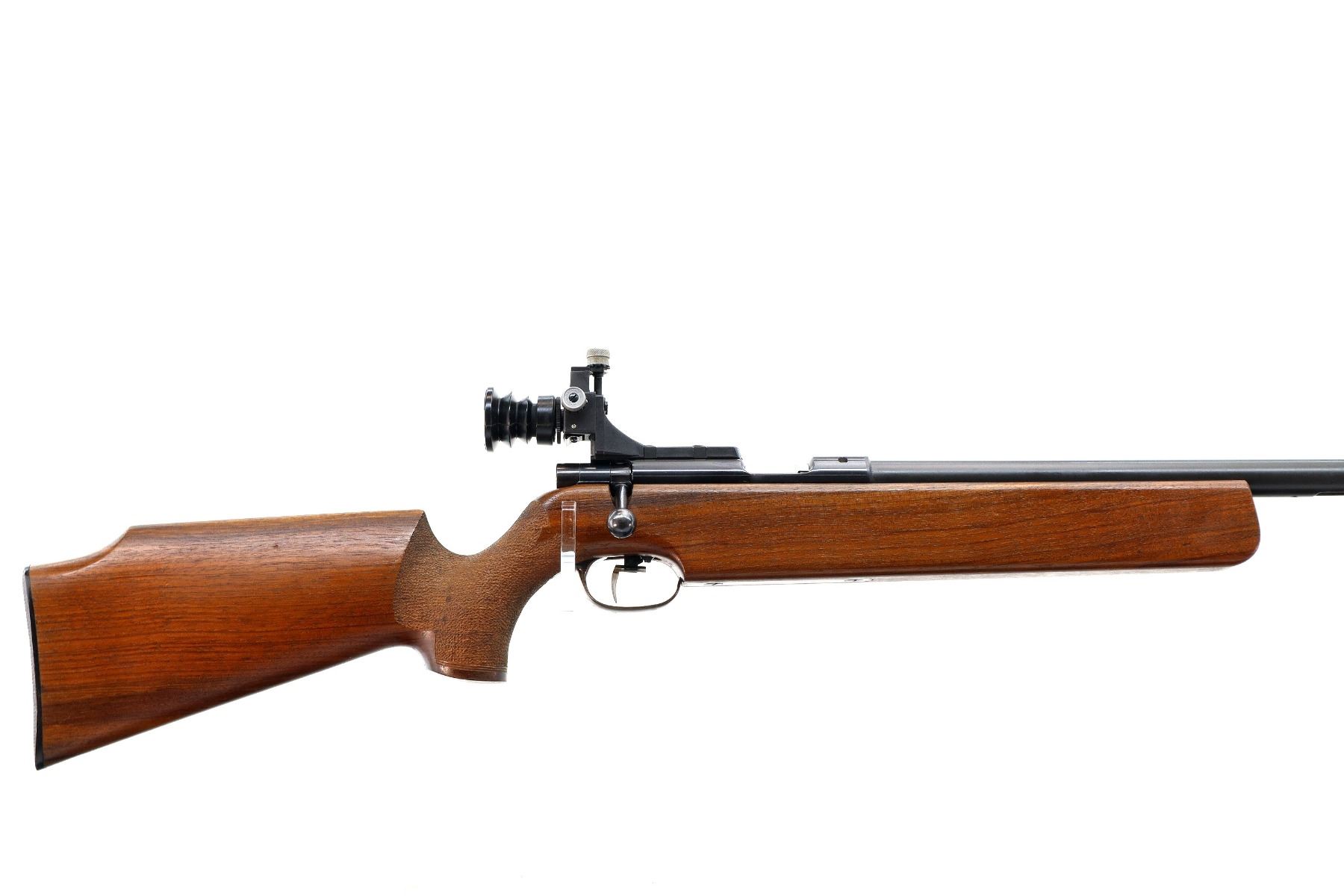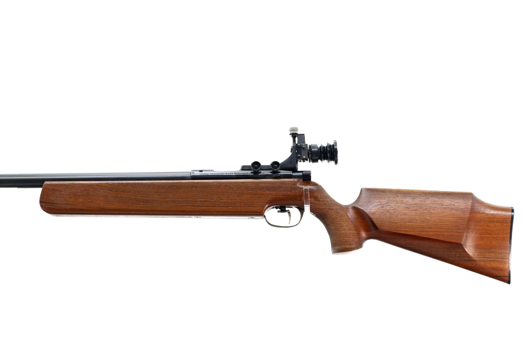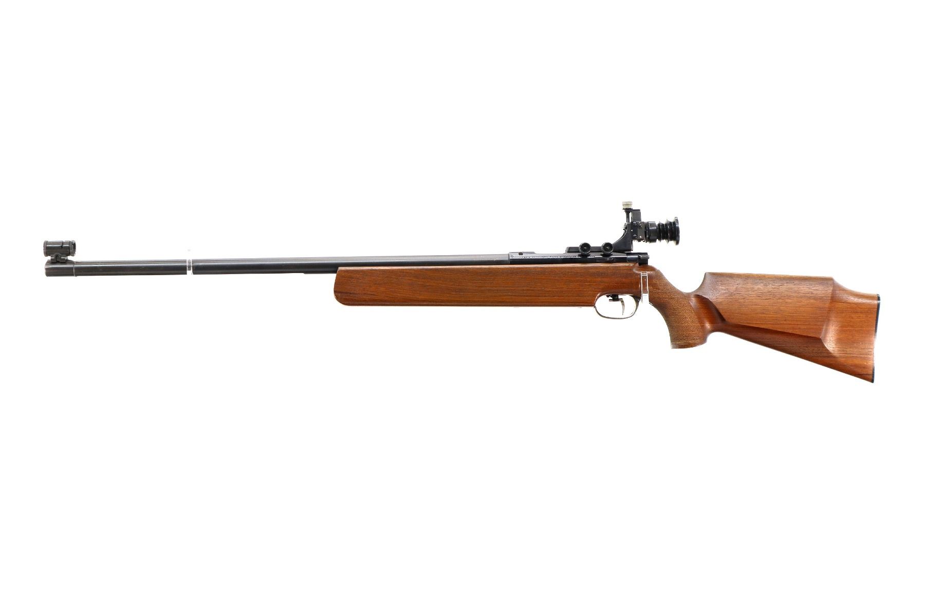 Main Description: This rifle has a shorter internal barrel with a large outside shroud which is slotted on the bottom. Globe front sight with insert and ramp, fully adjustable Anschutz rear target peep sight with large rubber eye cup, Satin blued barrel shroud, blued receiver, smooth bolt knob, fully adjustable trigger. One piece wood target stock, large forearm, textured thumb rest pistol grip, cheek rest, checkered black polymer butt plate, 14" LOP.